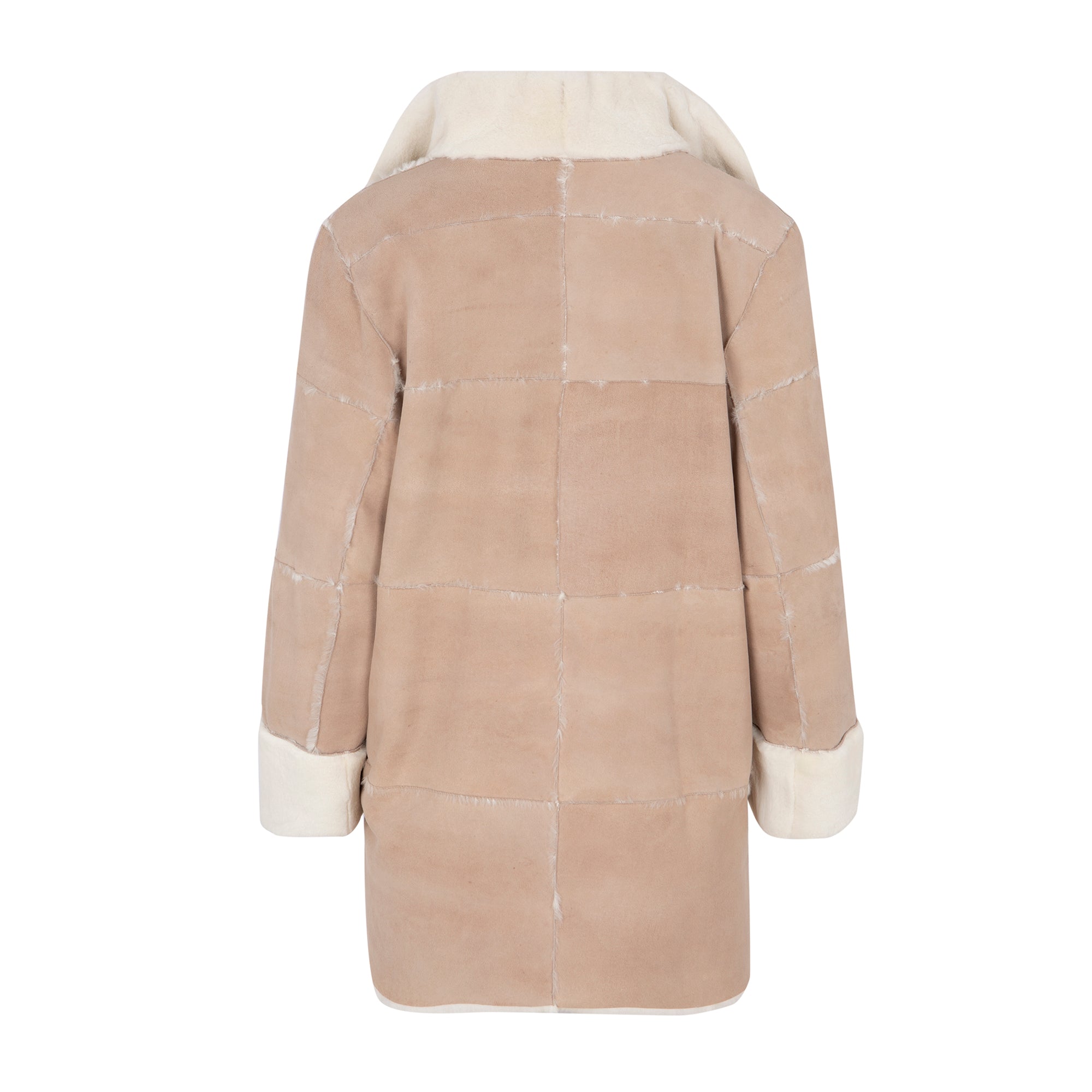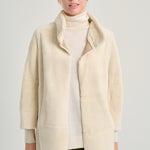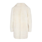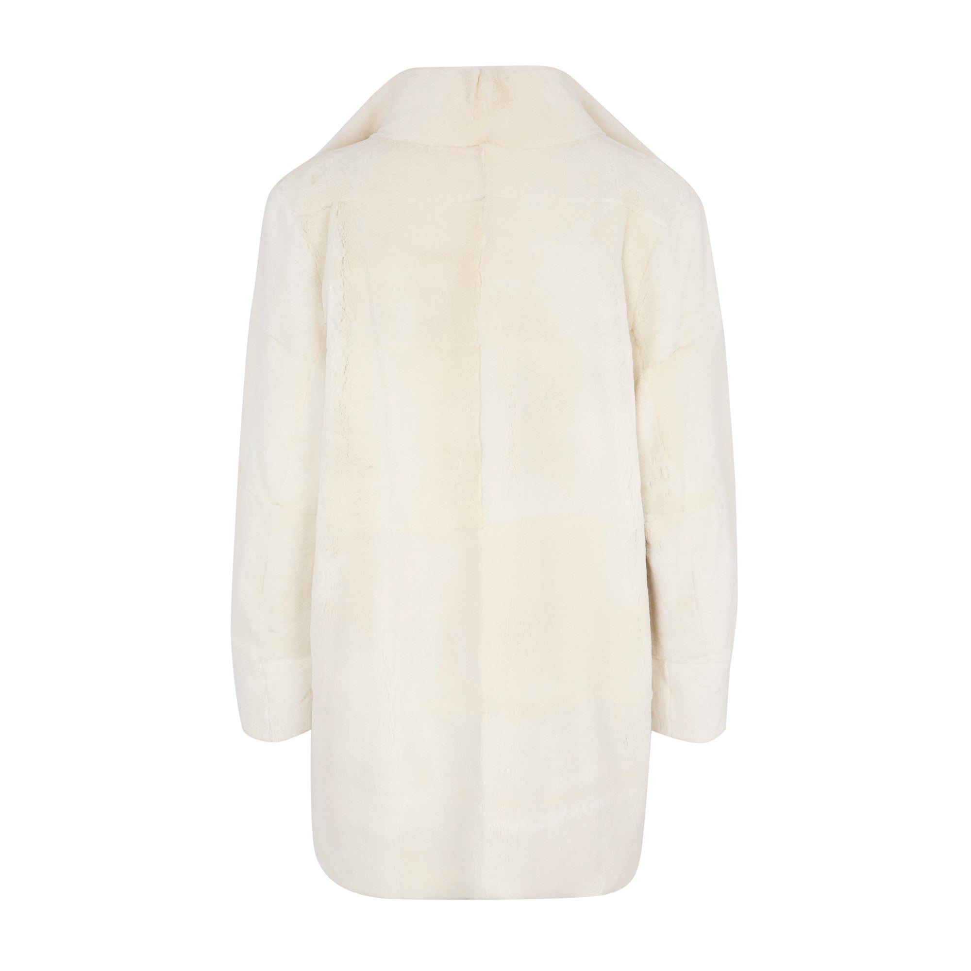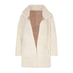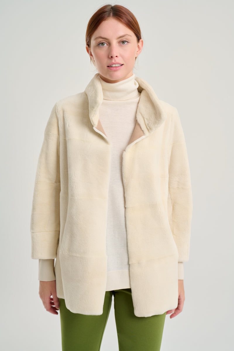 Chaquetón en pelo de visón rasado, desestructurado con solapa alta y reversible acabado arena. Patrón fluido y refuerzo bolsillos interior en napa. Color blanco. Fabricado en España.