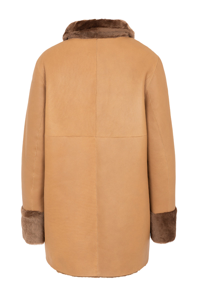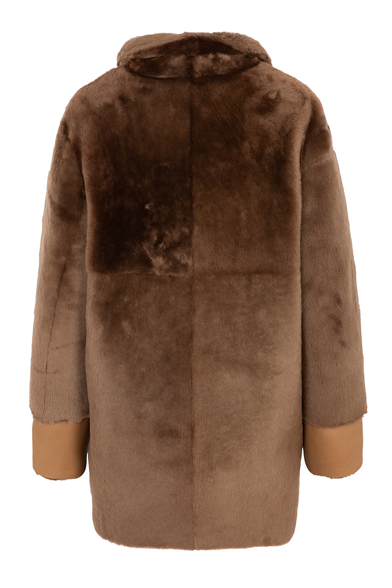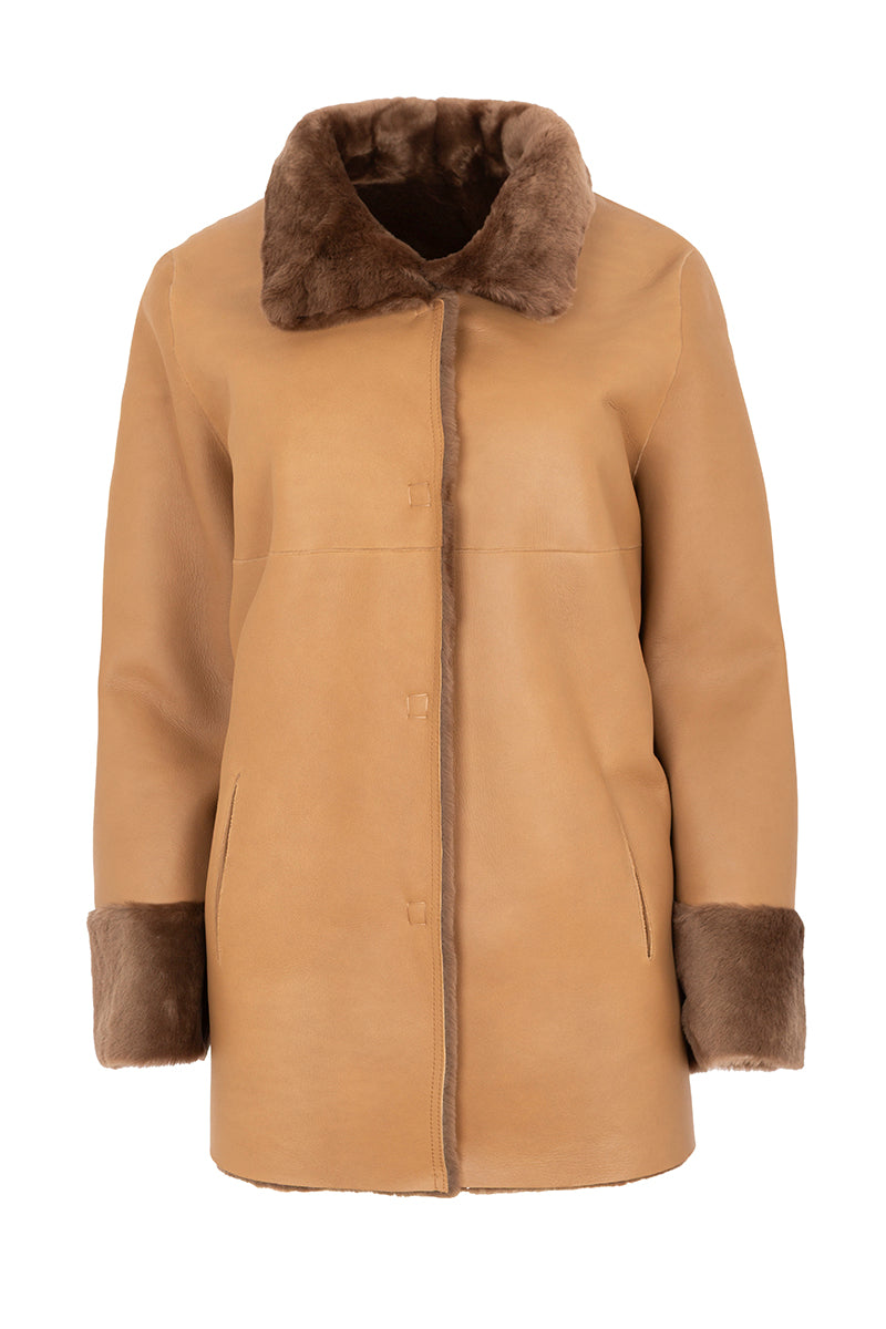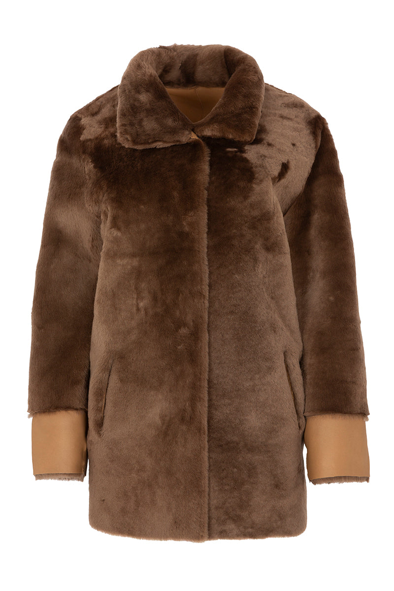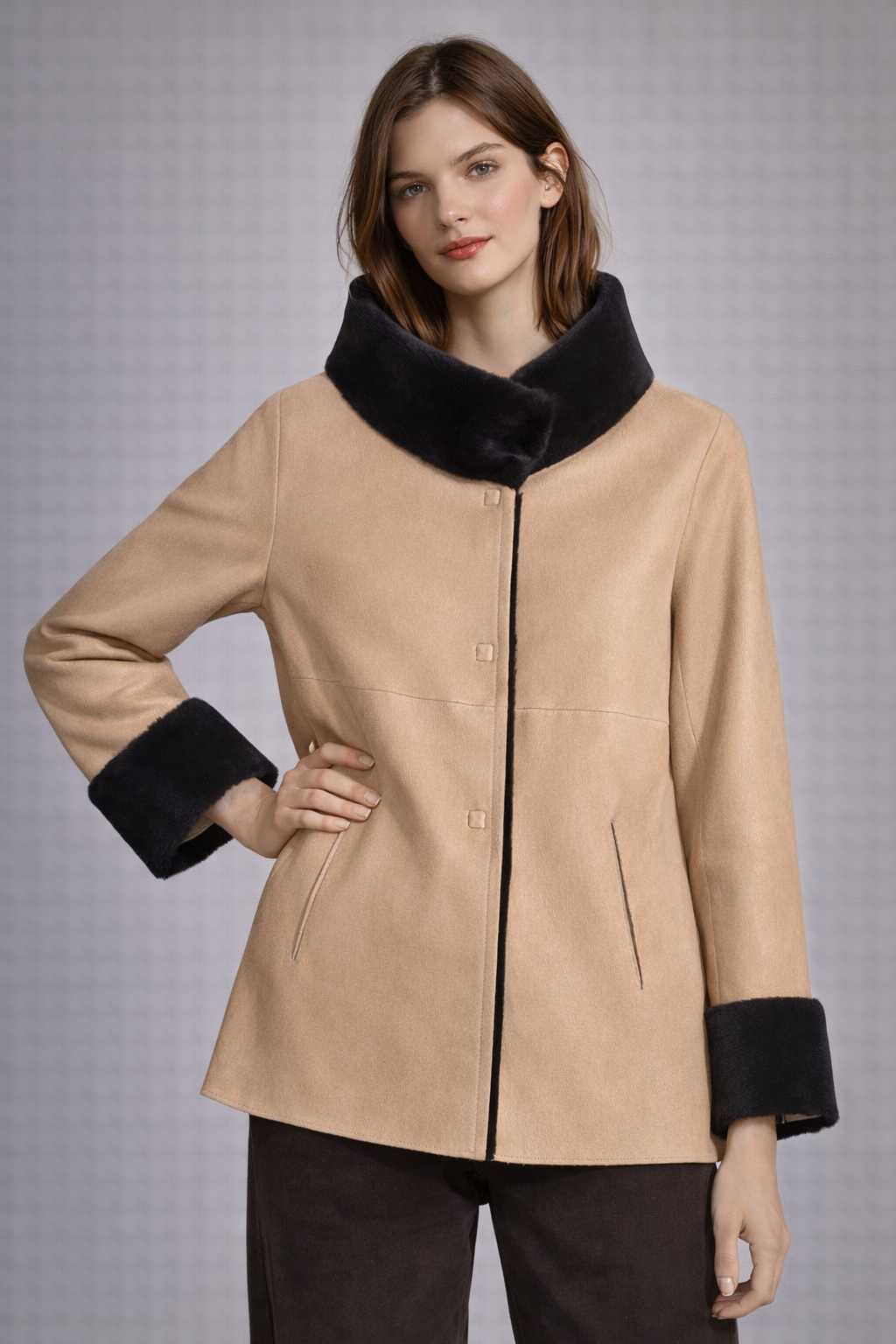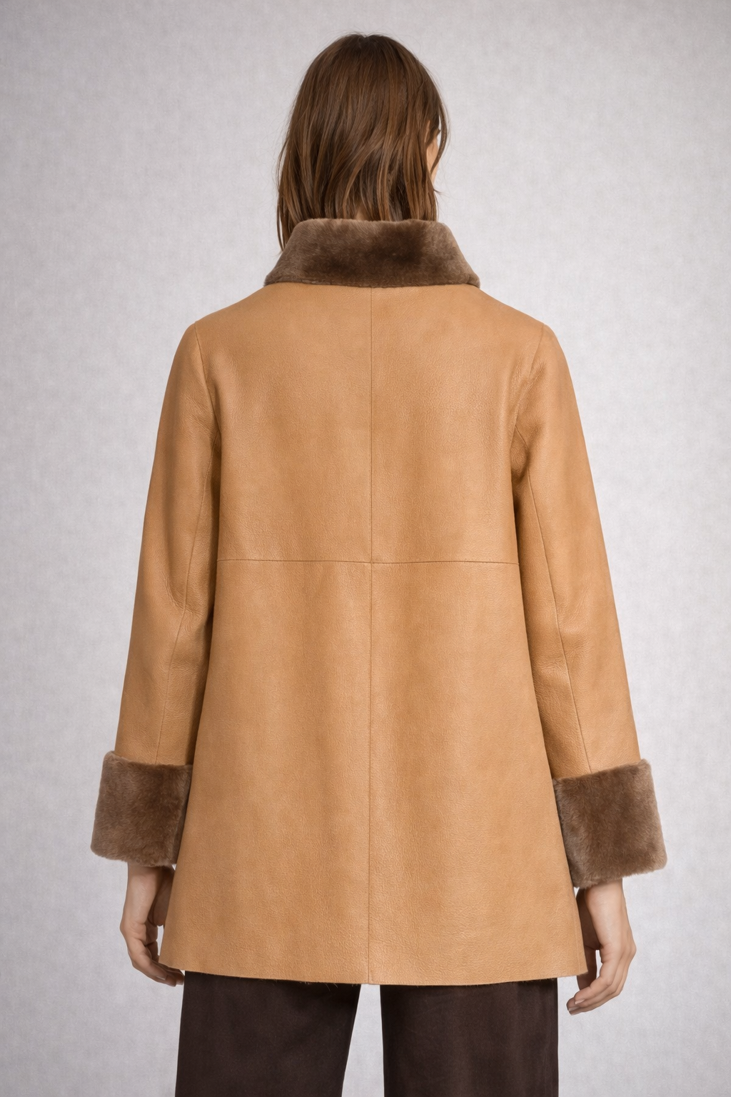 Chaquetón de piel de cordero español acabado en ante. Cuello con cierre imantado, reversible y bicolor en piel tabaco y pelo café. Botón clip de carey. 100% Cordero español