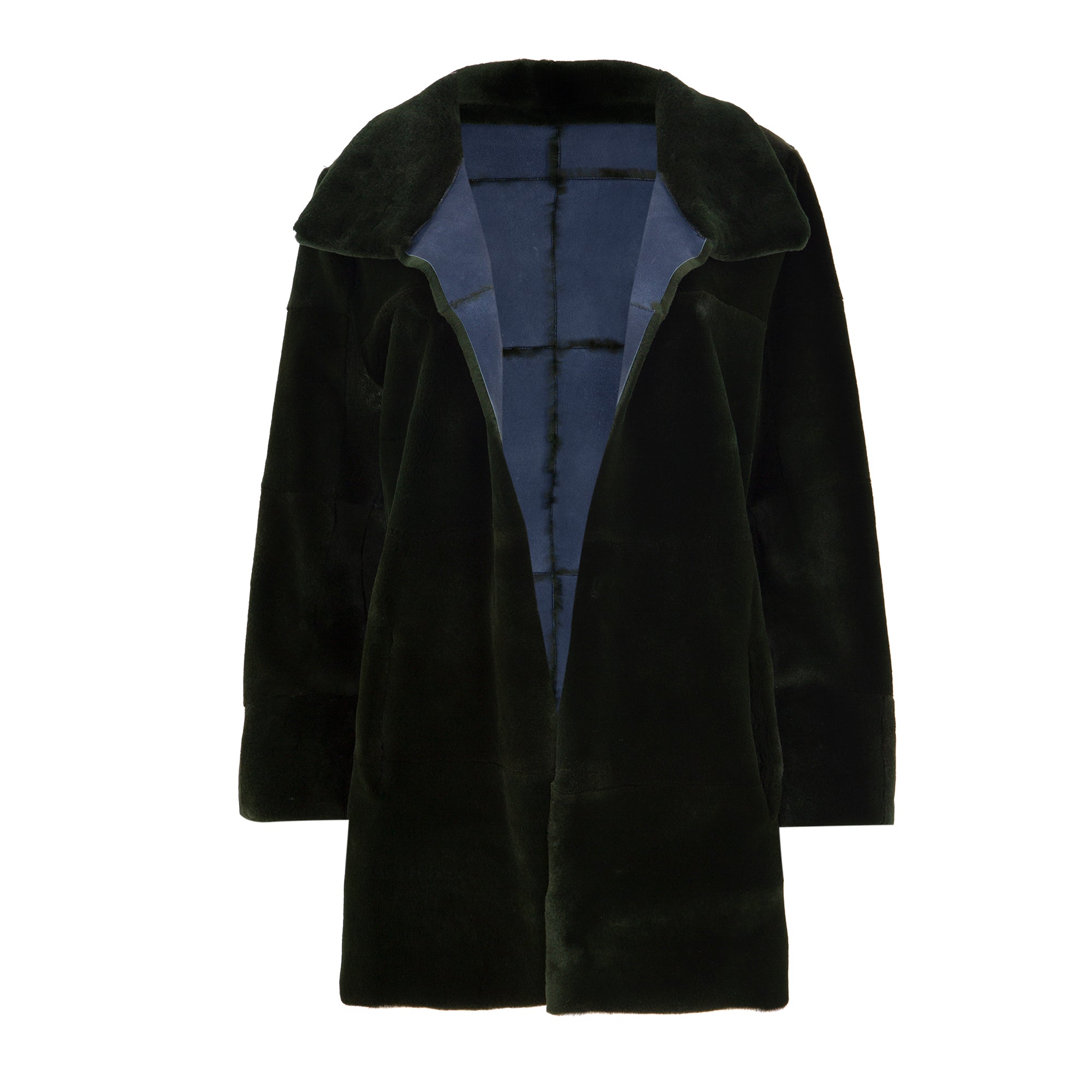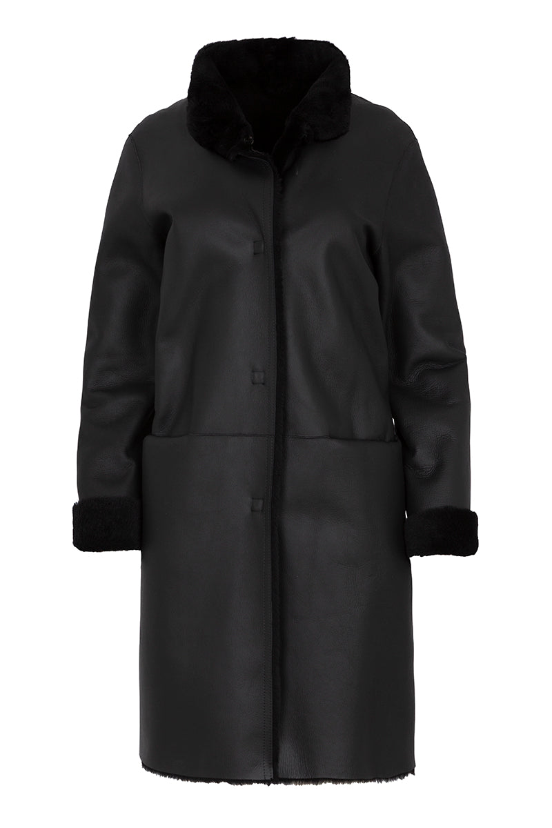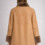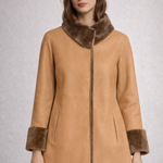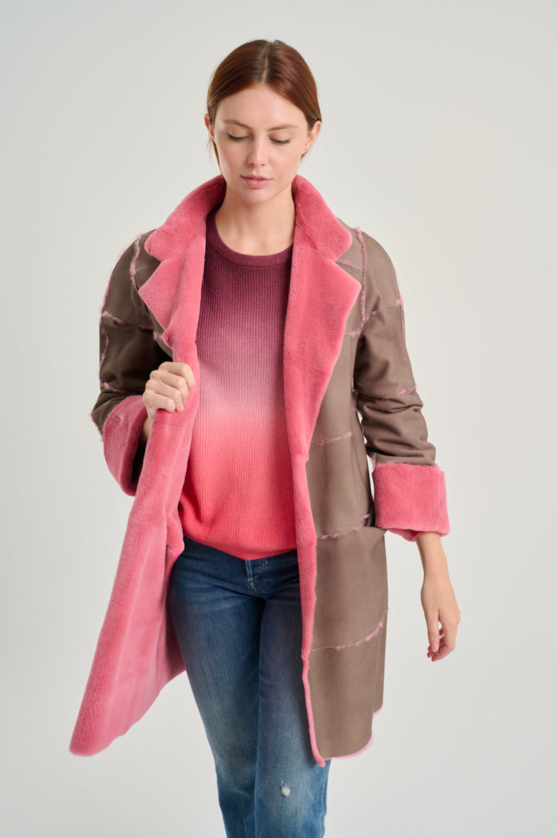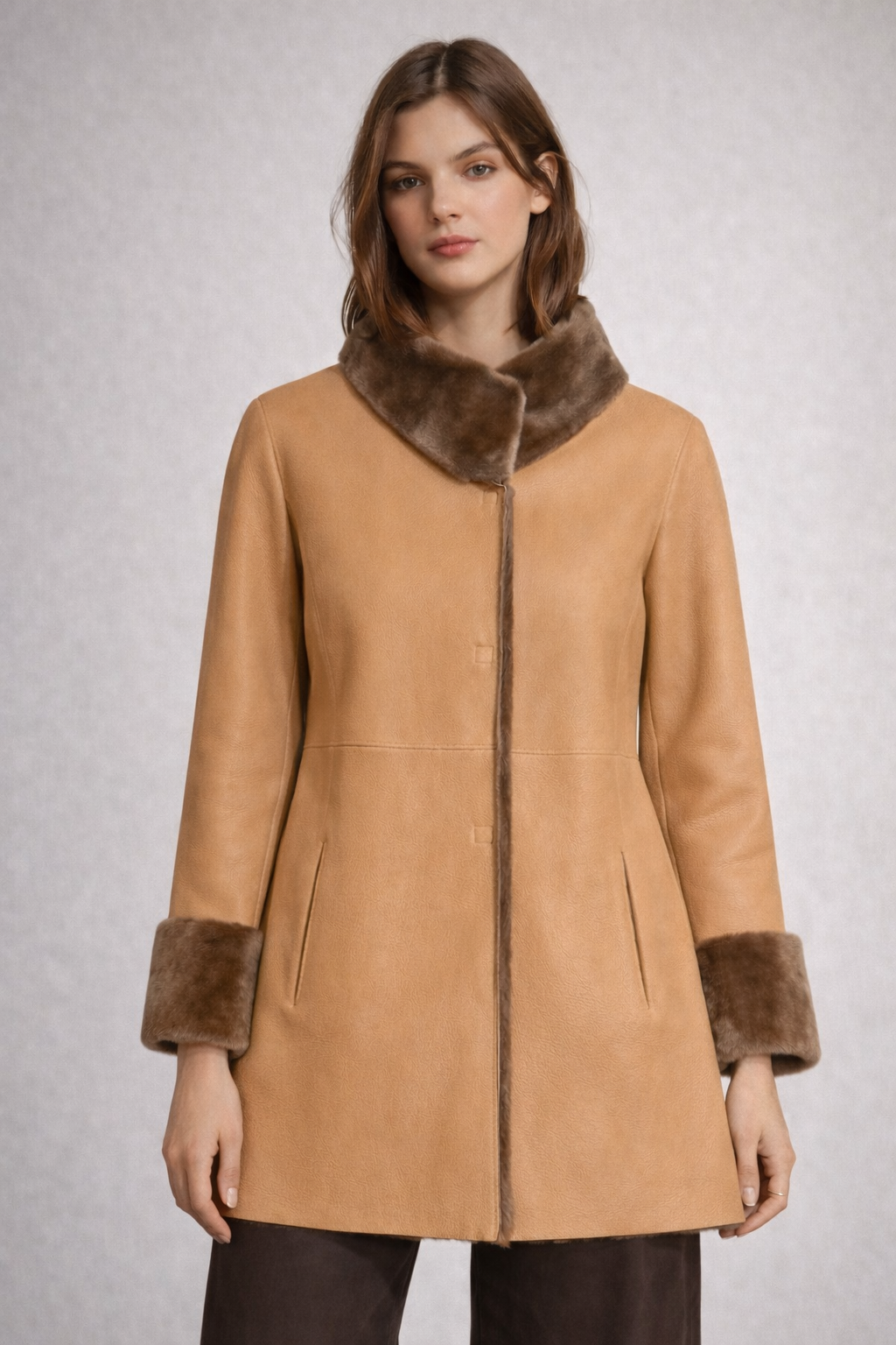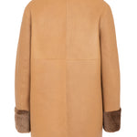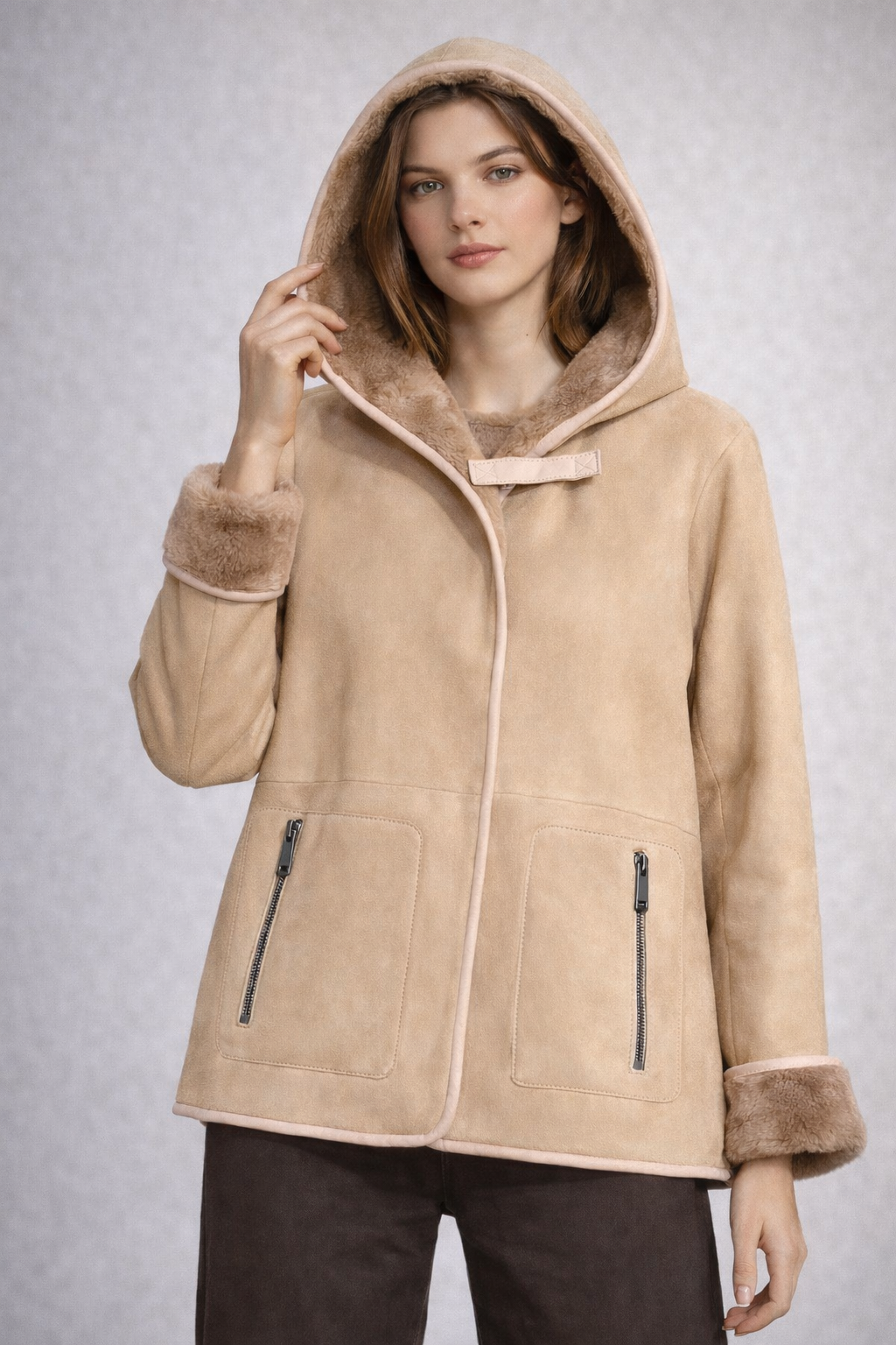 Chaquetón de piel de cordero español acabado en ante. Cuello con cierre imantado, reversible y bicolor en piel tabaco y pelo café. Botón clip de carey. 100% Cordero español