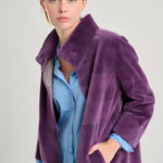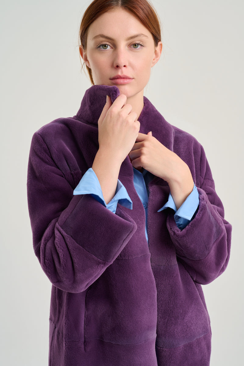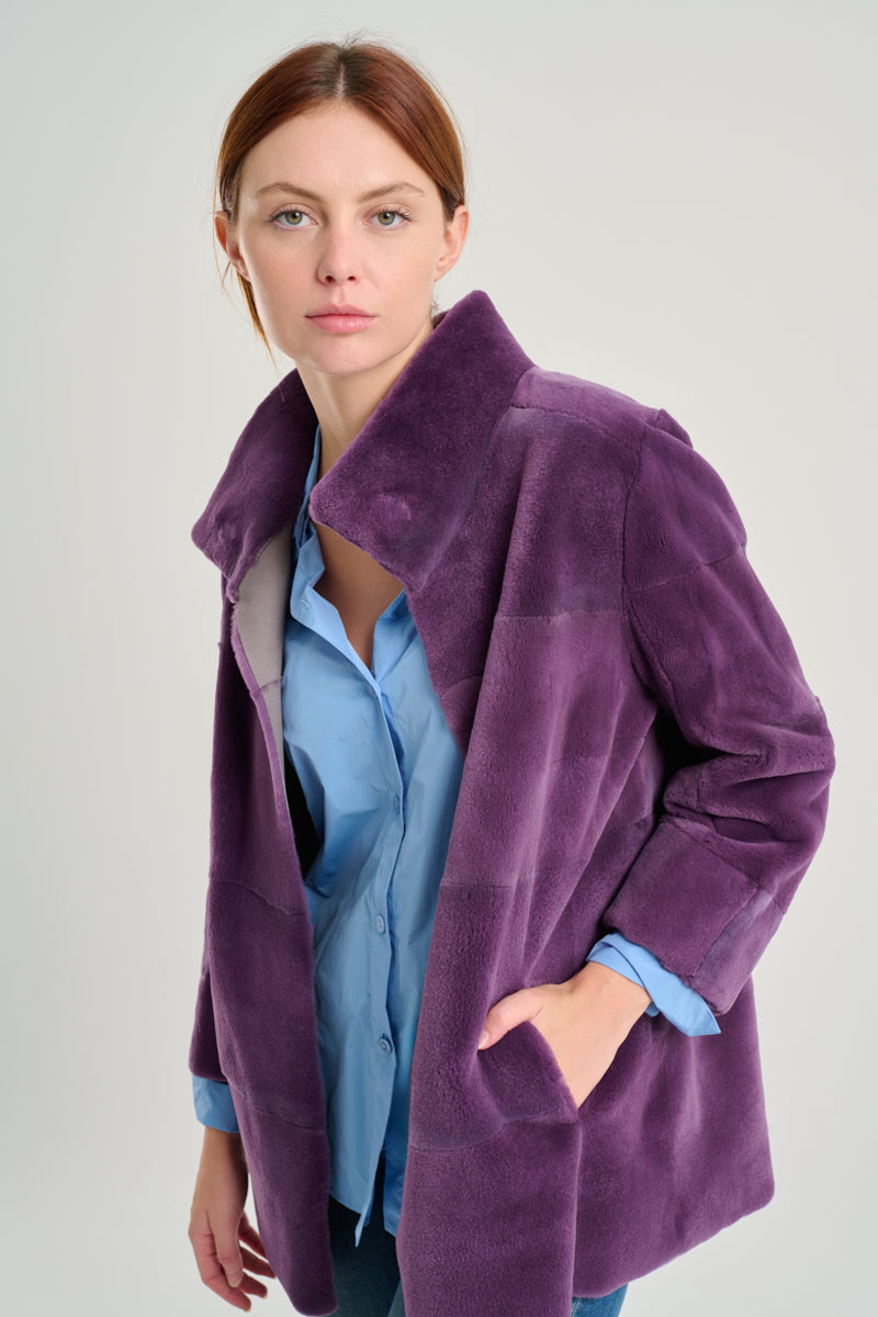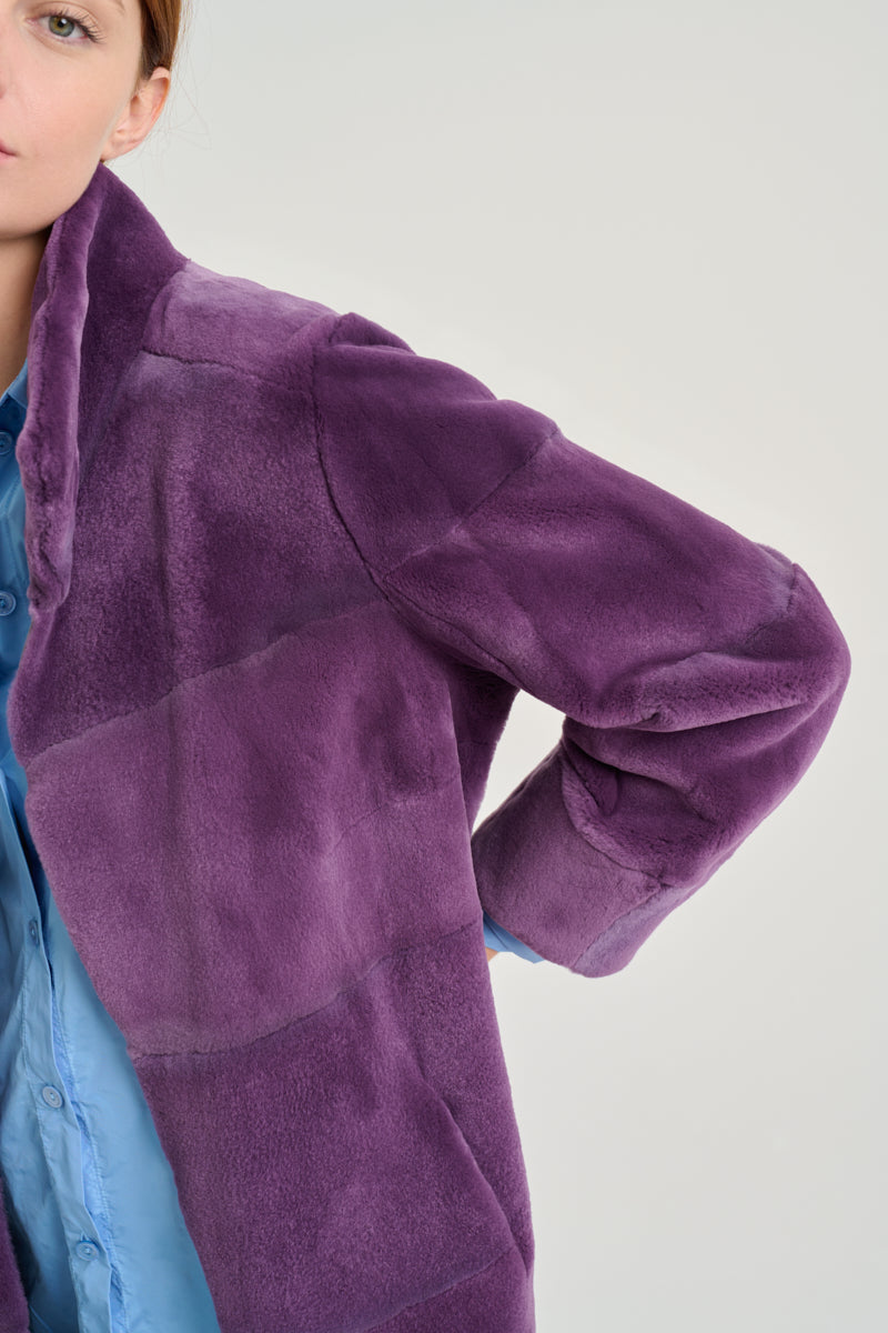 Chaquetón en pelo de visón rasado, desestructurado con solapa alta y reversible acabado cuerda. Patrón fluido y refuerzo bolsillos interior en napa. Color morado y gris.