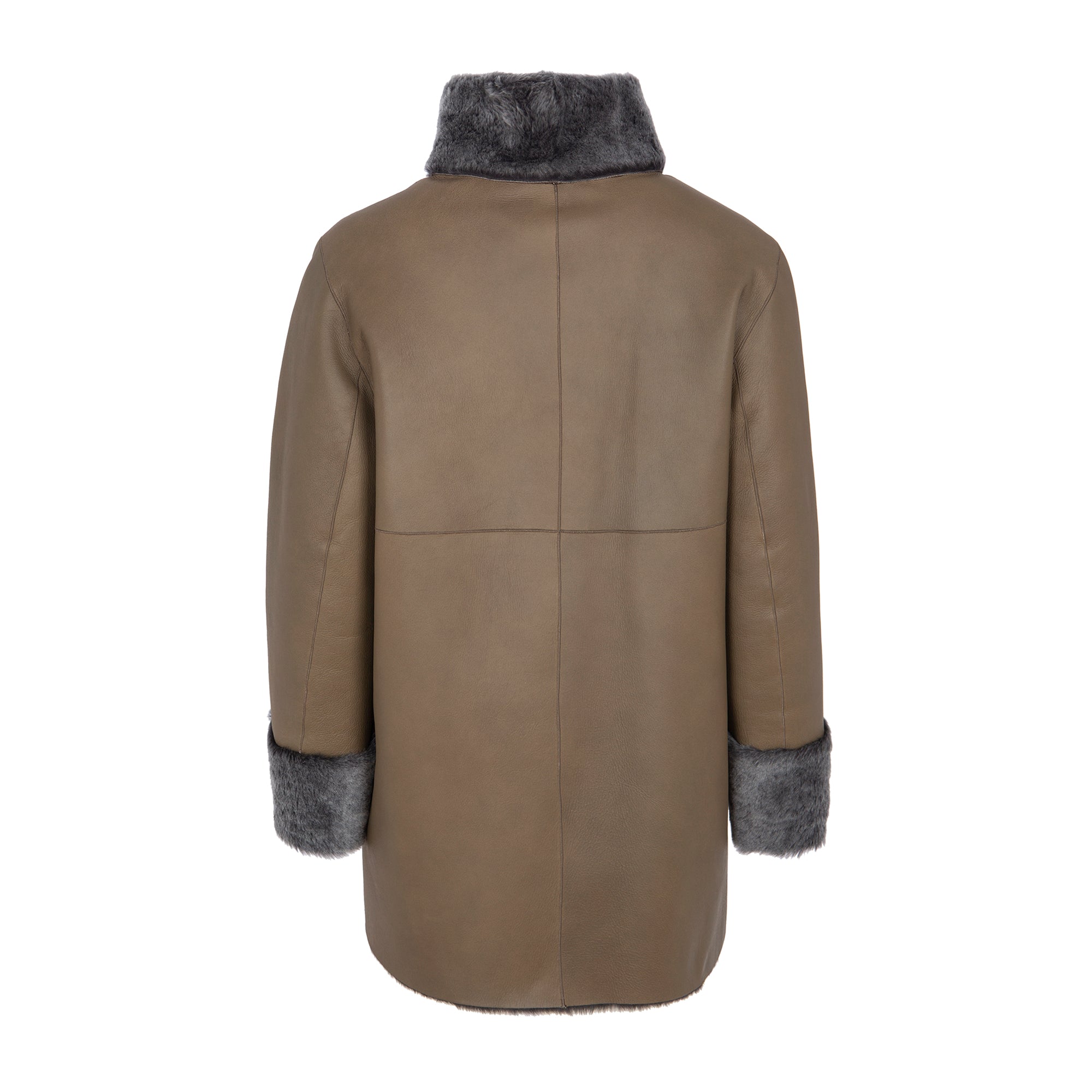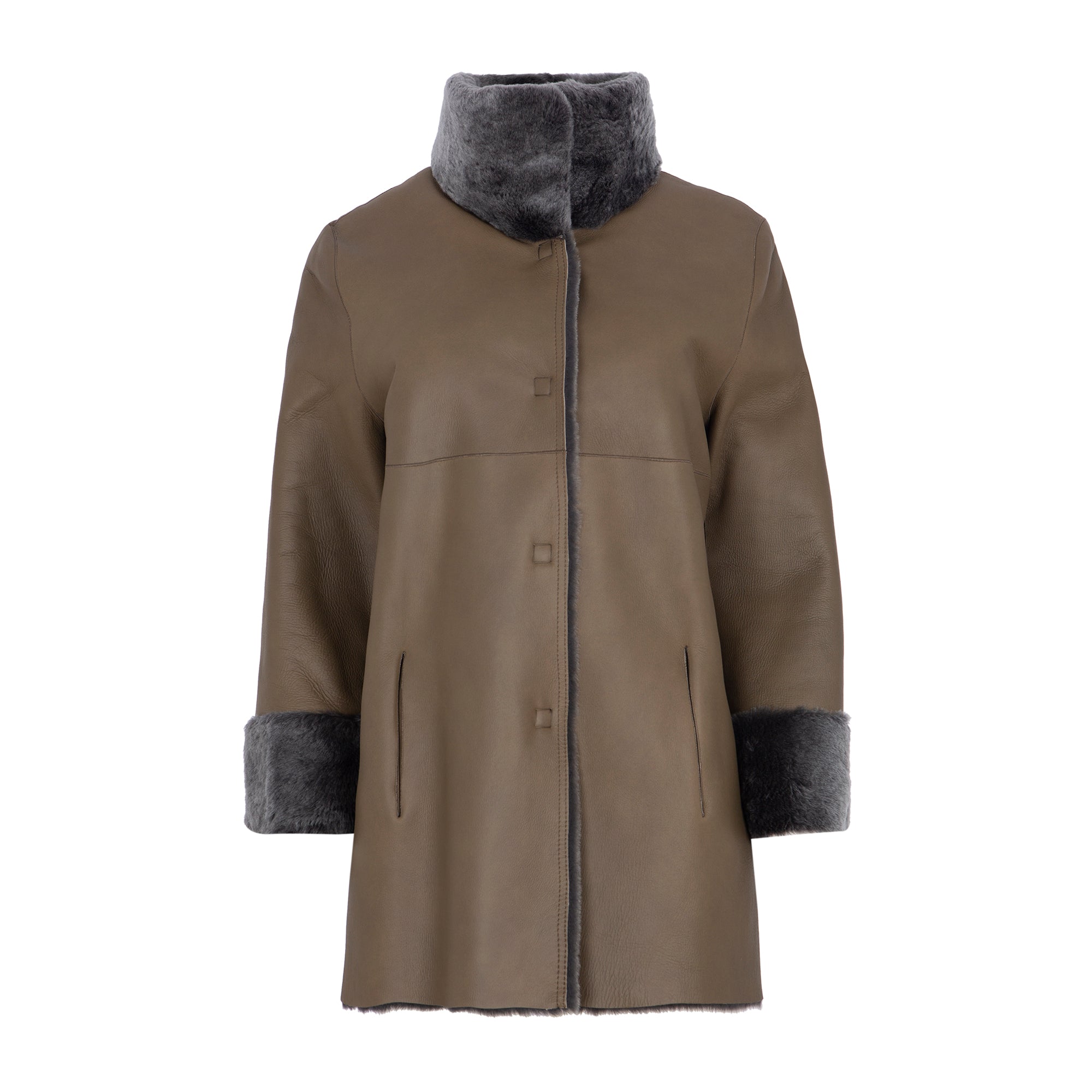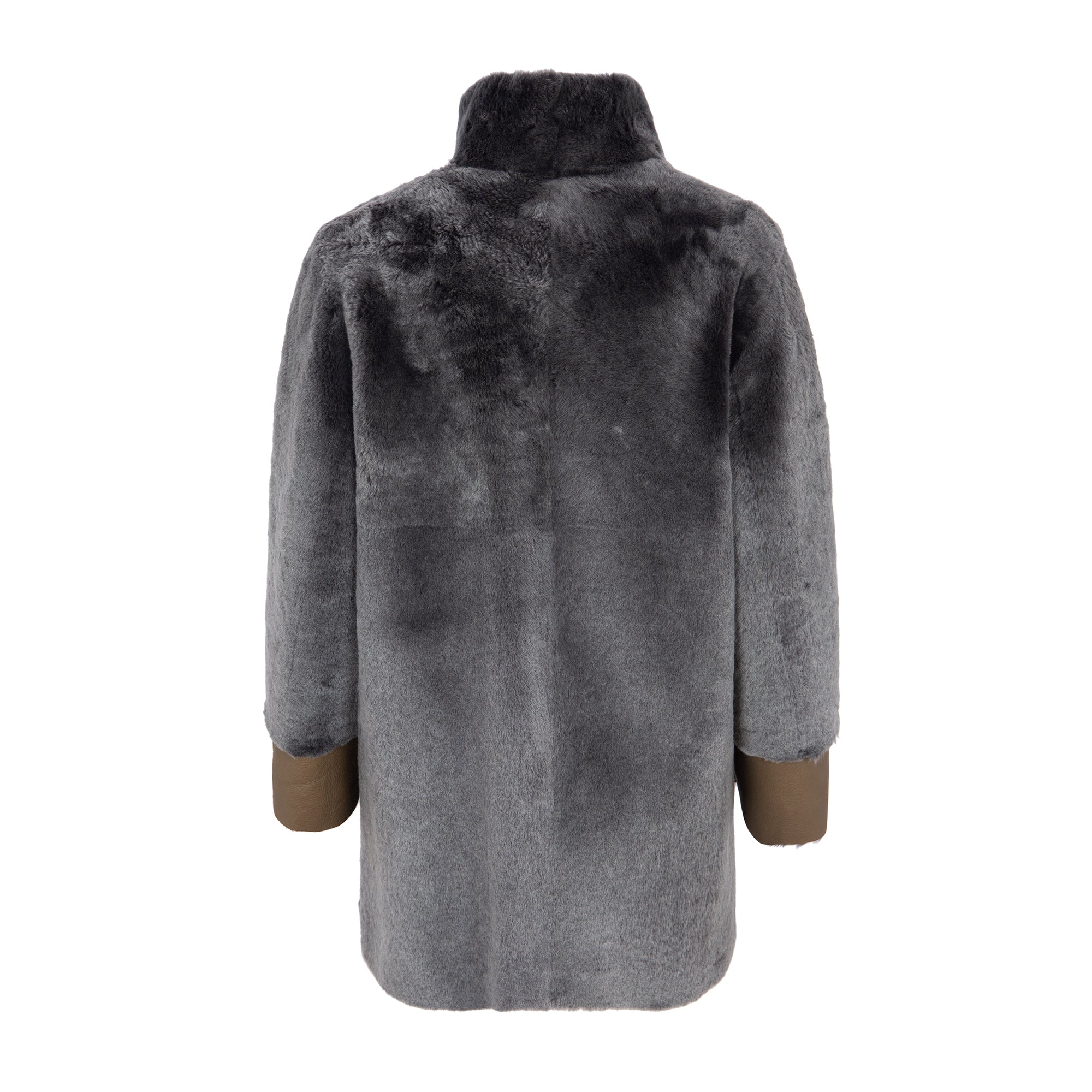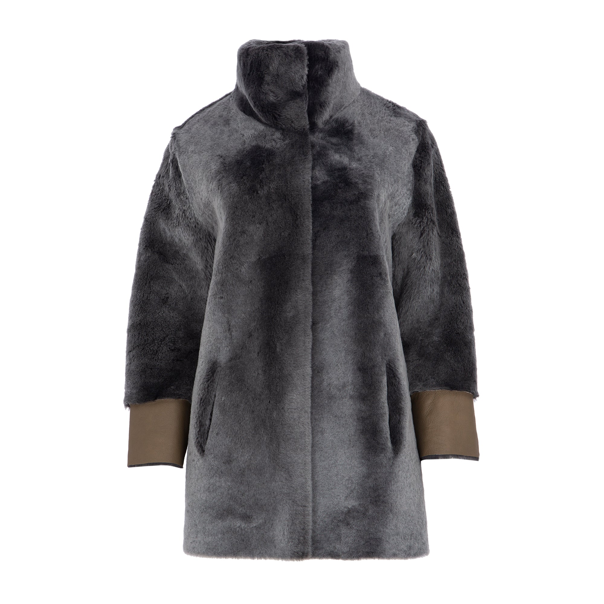 Chaquetón de piel de cordero español acabado en napa. Manga francesa, cuello con cierre imantado, reversible. Interior en napa color hoja seca y el exterior pelo tratado en color antracita. Botón clip de carey. 100% Cordero español.