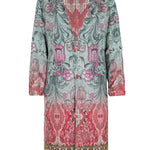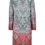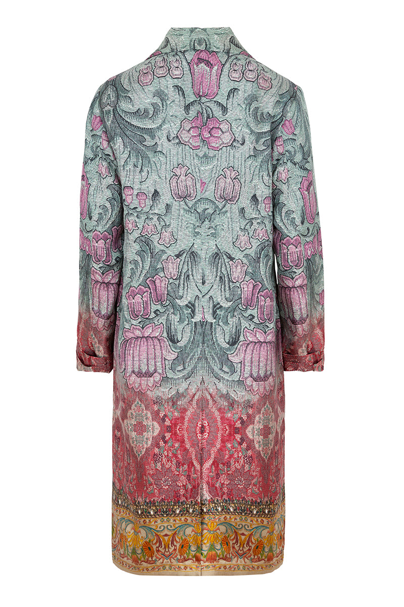 Abrigo de seda con solapa y bolsillos con tapeta, cierre con botón forrado al tono. Estampado floral tipo tapiz con detalles barrocos en tonos gris, malva y tostado. Abertura en la espalda. Posibilidad de llevarlo reversible. Composición: 100% Seda. Hecho en Italia. Tallaje italiano.