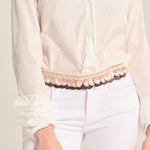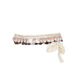 Cinturón de la firma italiana Sara Roka de grosgrain en color marfil de doble vuelta con detalle frontal en pasamanería de swarovski y lentejuelas de diferentes tamaños en tonos gris, blanco, berenjena y rosa palo colgando. Composición: 60% viscosa, 40% algodón. Hecho en Italia.