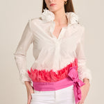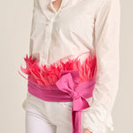 Cinturón de la firma italiana Sara Roka de grosgrain en color fucsia con detalle de plumas en uno de sus bordes. Composición: 60% viscosa,40% algodón. Hecho en Italia.