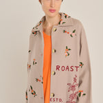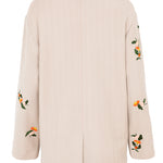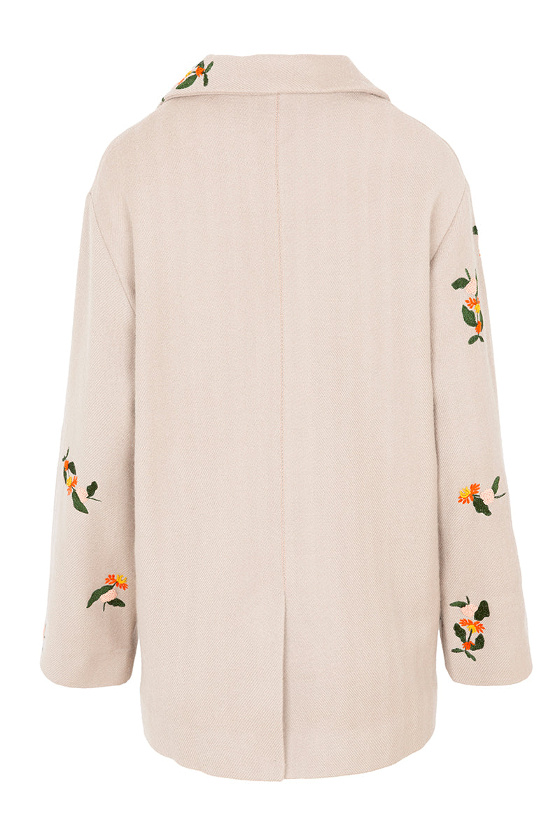 Abrigo corto evasé de la marca Laïte, con bordados artesanales esparcidos por toda la prenda formando ramilletes en naranja, rosa verde y amarillo, detalle también bordado en el lado izquierdo evocando la estampa de un saco de café y su planta en tono granate, todo esto, sobre un fondo malva empolvado, corte en media capa, cuello plano semiabierto, manga recta, bolsillo invisible y cierre con botones bicolor. Composición: 100% lana.