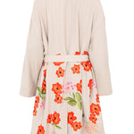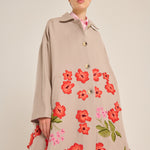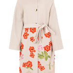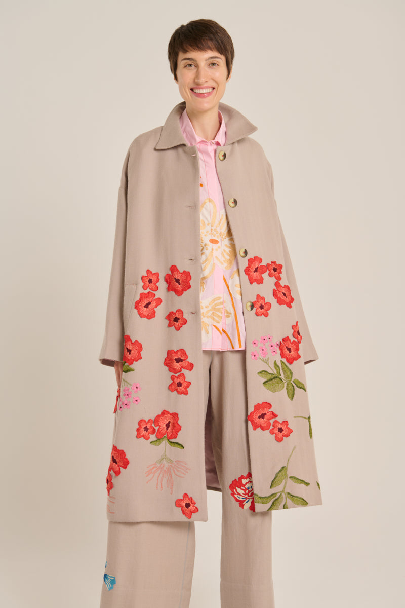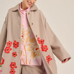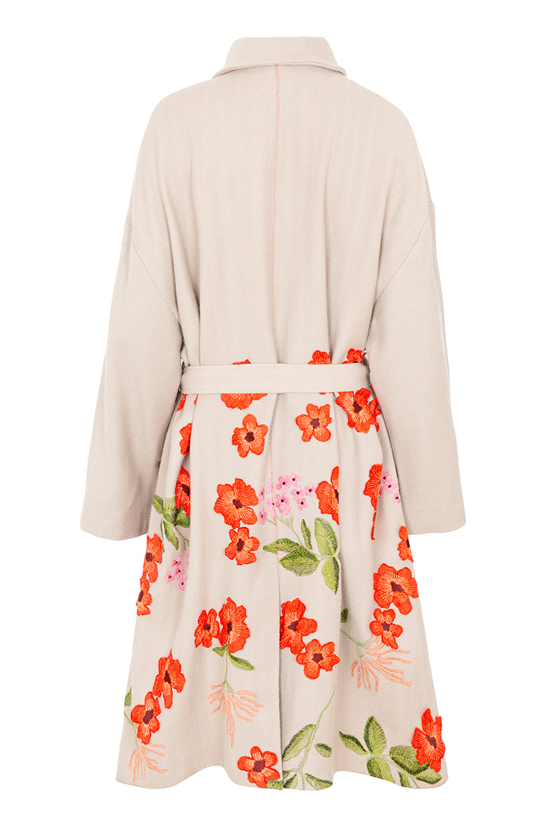 Abrigo oversize de la marca Laïte, con bordados artesanales en el propio tejido y flores 3D en rojo, rosa, verde y naranja que resaltan sobre un fondo malva empolvado, corte en media capa, cuello plano semiabierto, manga recta, bolsillo sastre y cierre con botones bicolor. Composición: 100% lana.