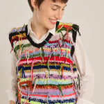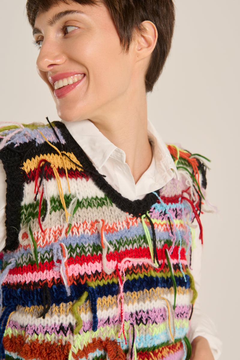 Chaleco con escote pico de la firma italiana Cavia. Tejido artesanalmente formando rallas multicolor desflecadas y remate de escote y sisa en negro. Composición mixta (upcycling), mayormente algodón . Hecho en Italia. Tallaje italiano.