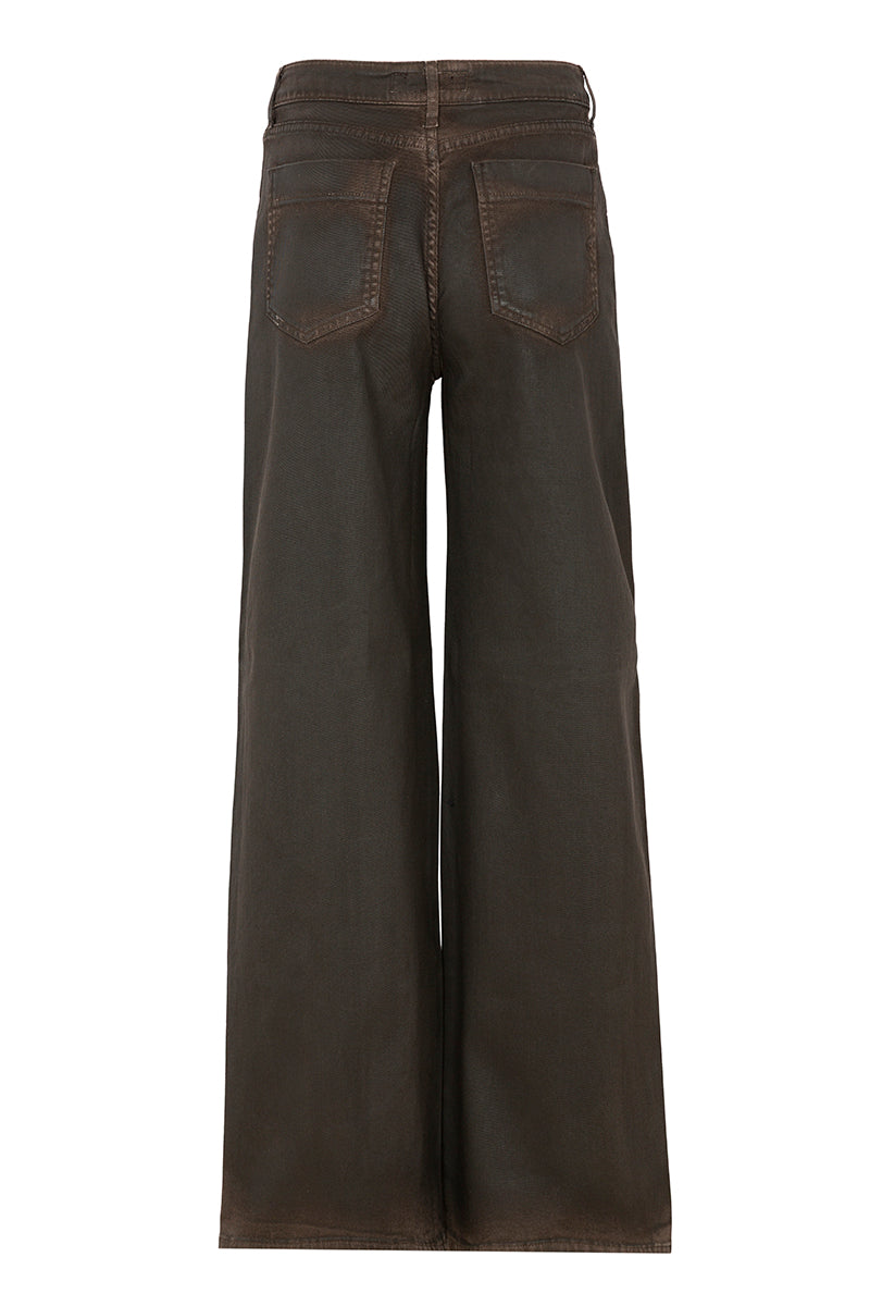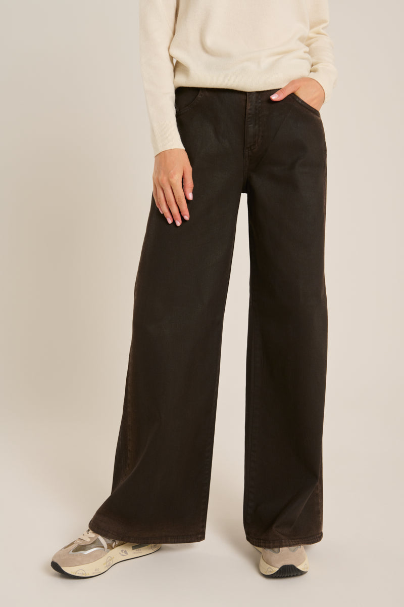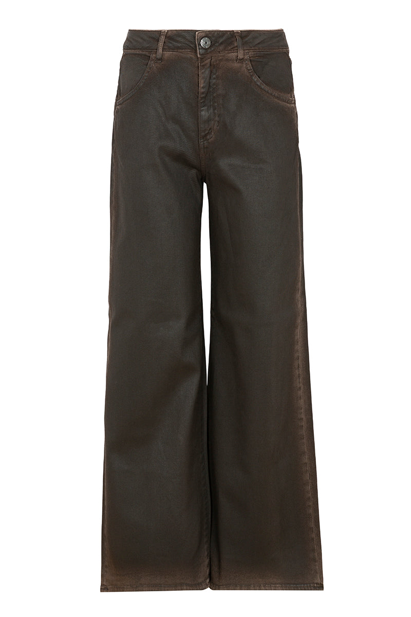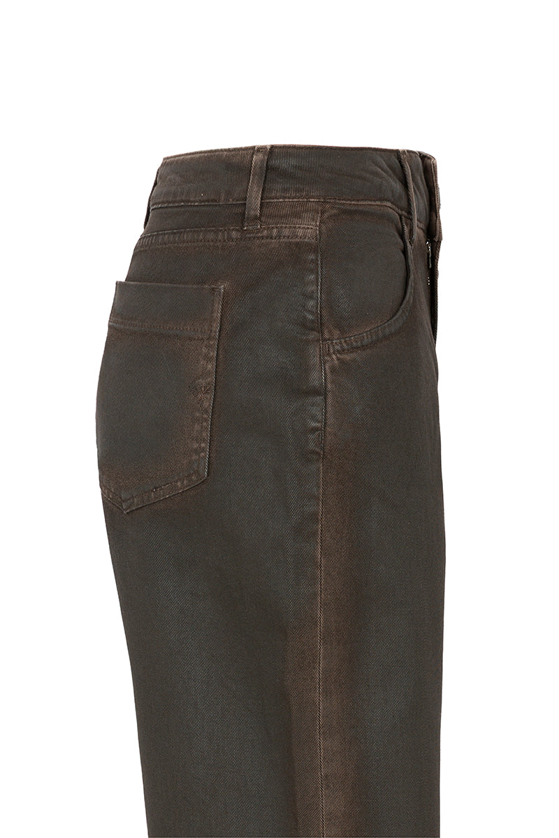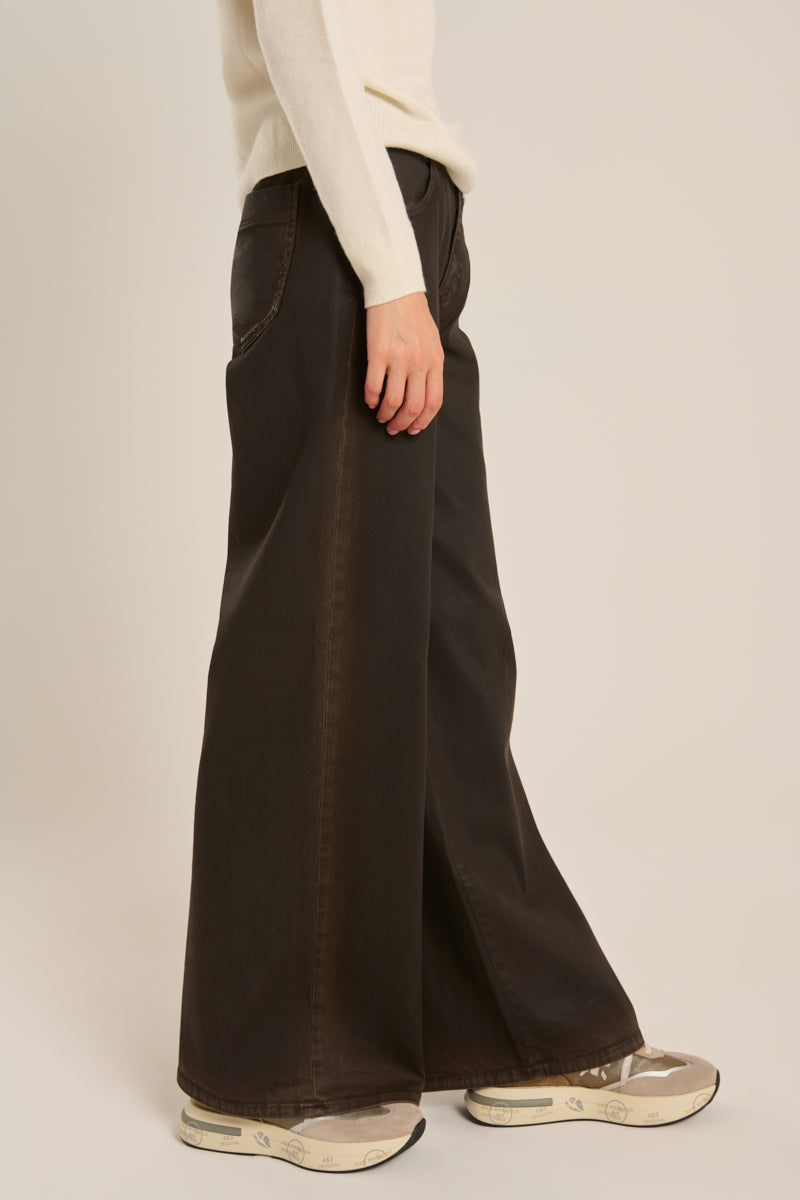 Pantalón vaquero 5 bolsillos estilo over, de la línea ” Fluide” de Shaft. Talle alto, pernera ancha y cierre con cremallera y botón joya. Color marrón chocolate, con acabado desgastado desigual que hace cada pieza sea única. Composición: 97% algodón , 3% elastan. Hecho en Italia.