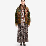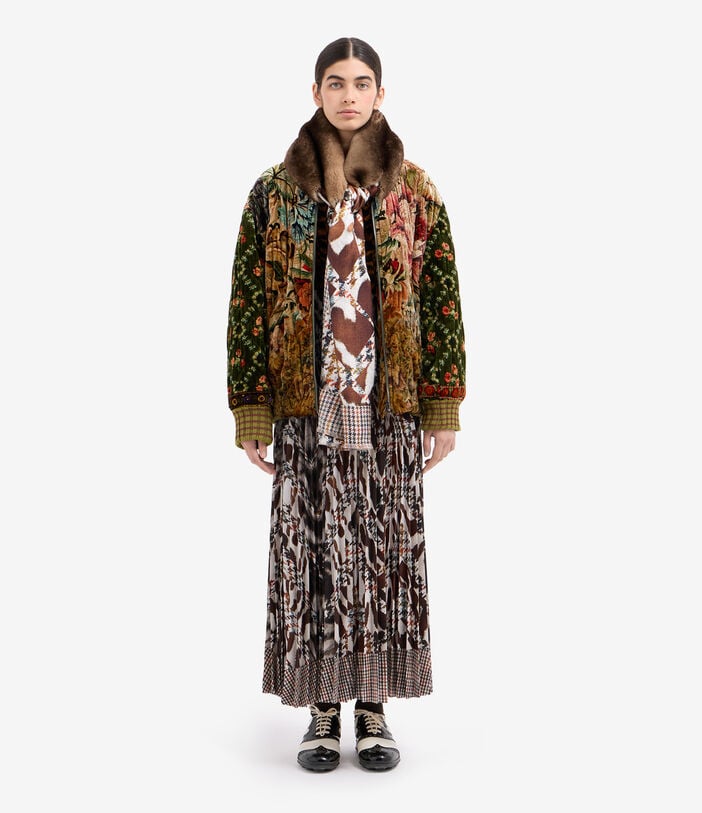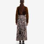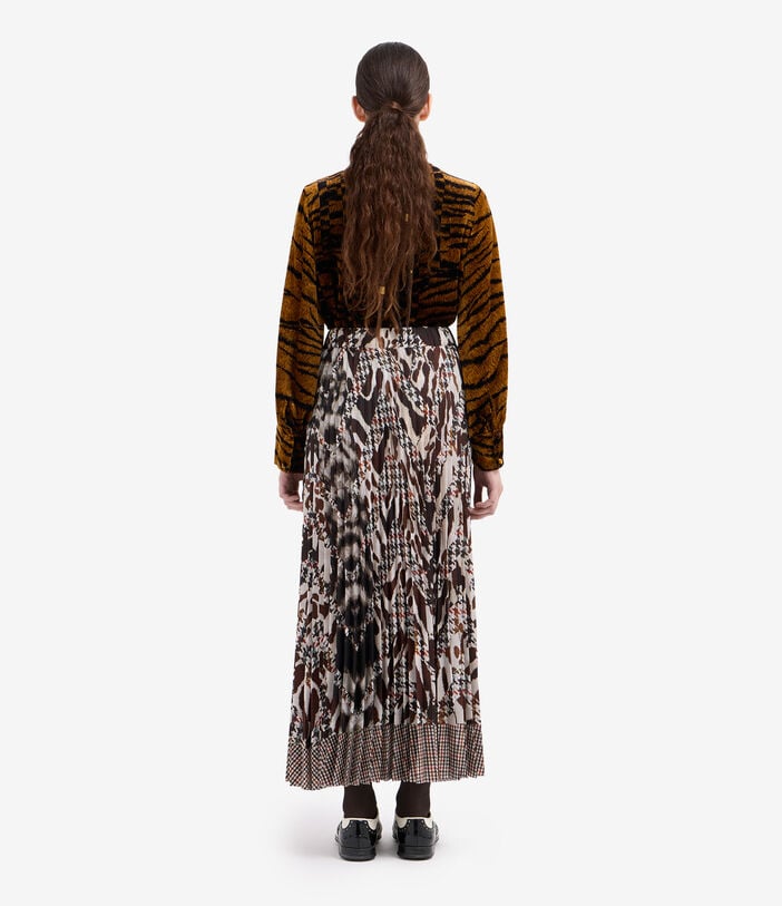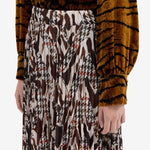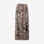 Falda larga plisada de la firma italiana Pierre-Louis Mascia. Estampado de pata de gallo en tonos marrón , crudo , gris, teja, intercalado con estampado de cebra al tono. Cinturilla elástica. Composición: 100% poliéster. Hecho en Italia. Tallaje italiano.