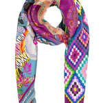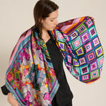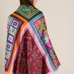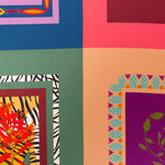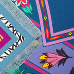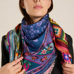 Pañuelo de seda de Franco Ferrari doble faz. Combinación de diferentes pañuelos en estampados croche multicolor, floral, geométrico y ornamental por un lado y el reverso igual pero otra gama de colores. Composición: 100% seda. Medidas:135x135 .Hecho en Italia.
