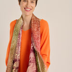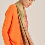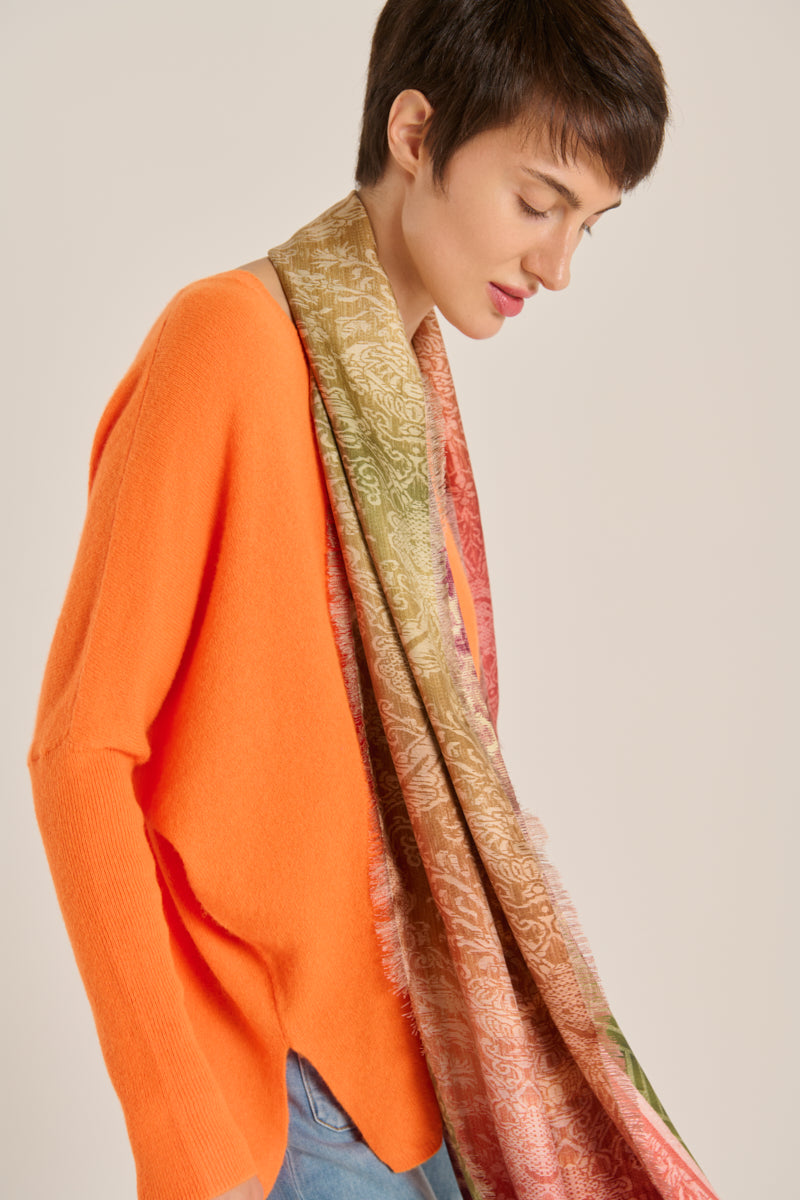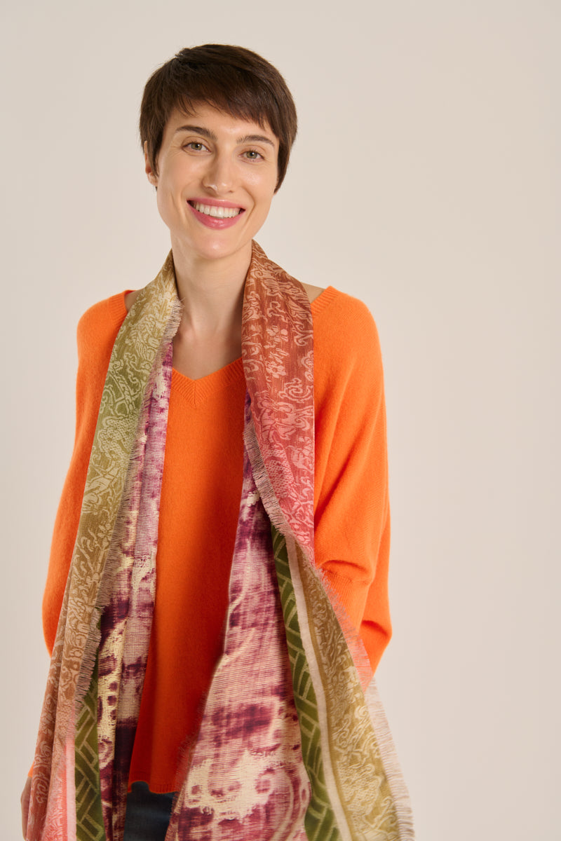 Pabuelo Pierre-Louis Mascia en seda natural. Su diseño de doble cara contrasta por un lado con estampado floral en degradé transitando por tonos verdes, tierra y burdeos, y por el otro, el mismo estampado floral burdeos, enmarcado por dos cenefas, una en tonos verdes y la otra en ocre .Composición: 100% seda. Desflecado medio. Tamaño: 65 x 190 cm. Hecho en Italia.