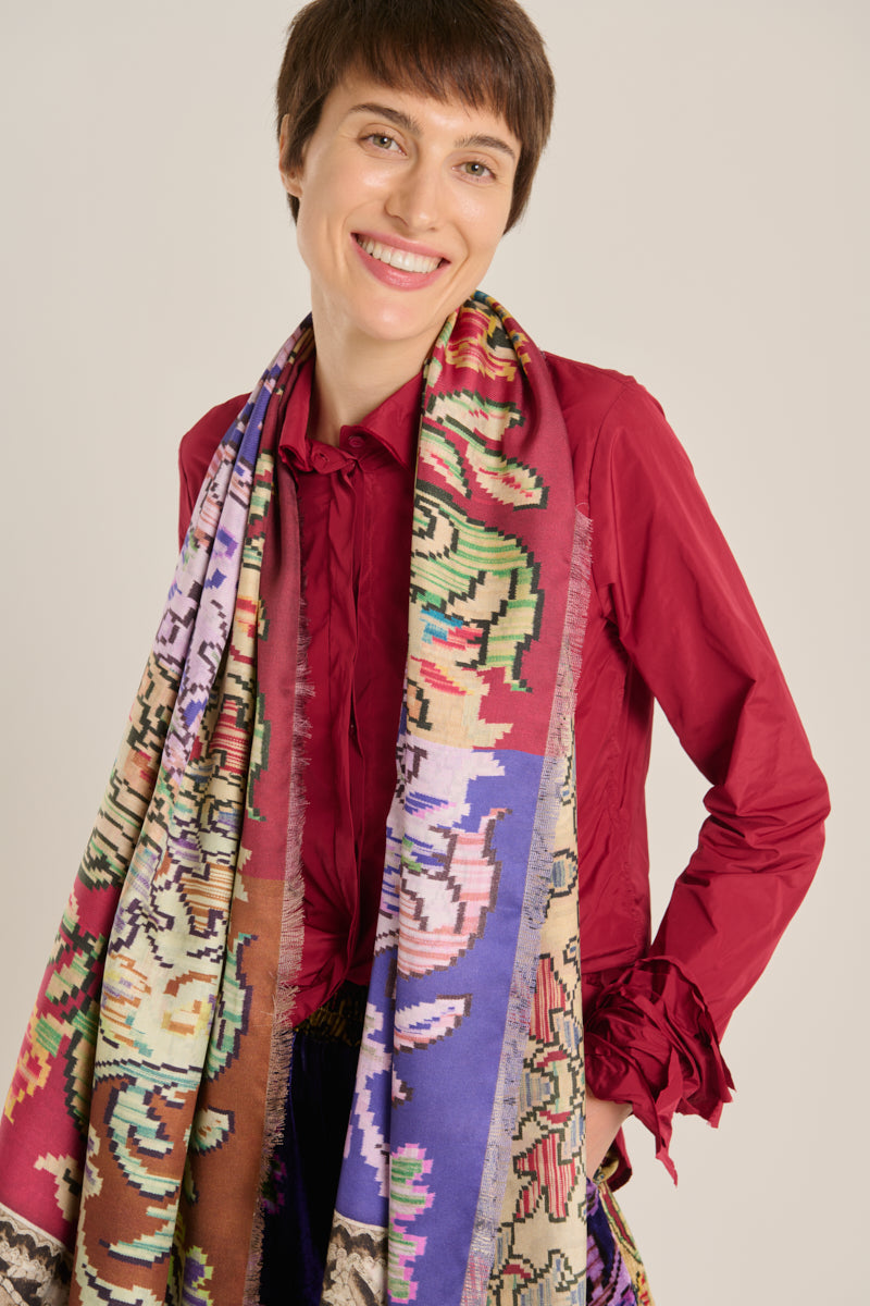 Pañuelo Pierre-Louis Mascia en seda natural. Su diseño de doble cara contrasta por un lado con estampado de estilo persa enmarcado entre dos cenefas en tonos grana, malva, verde, marrón y ocre, por el otro lado, con un patrón geométrico floral en tonos grana, verde, azul y marrón sobre fondo beige. Composición: 100% seda. Desflecado medio. Tamaño: 65 x 190 cm. Hecho en Italia.
