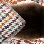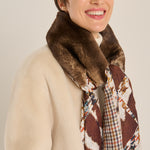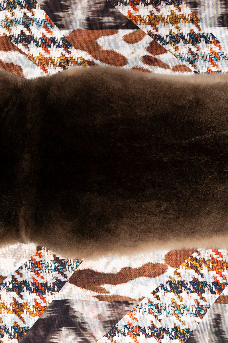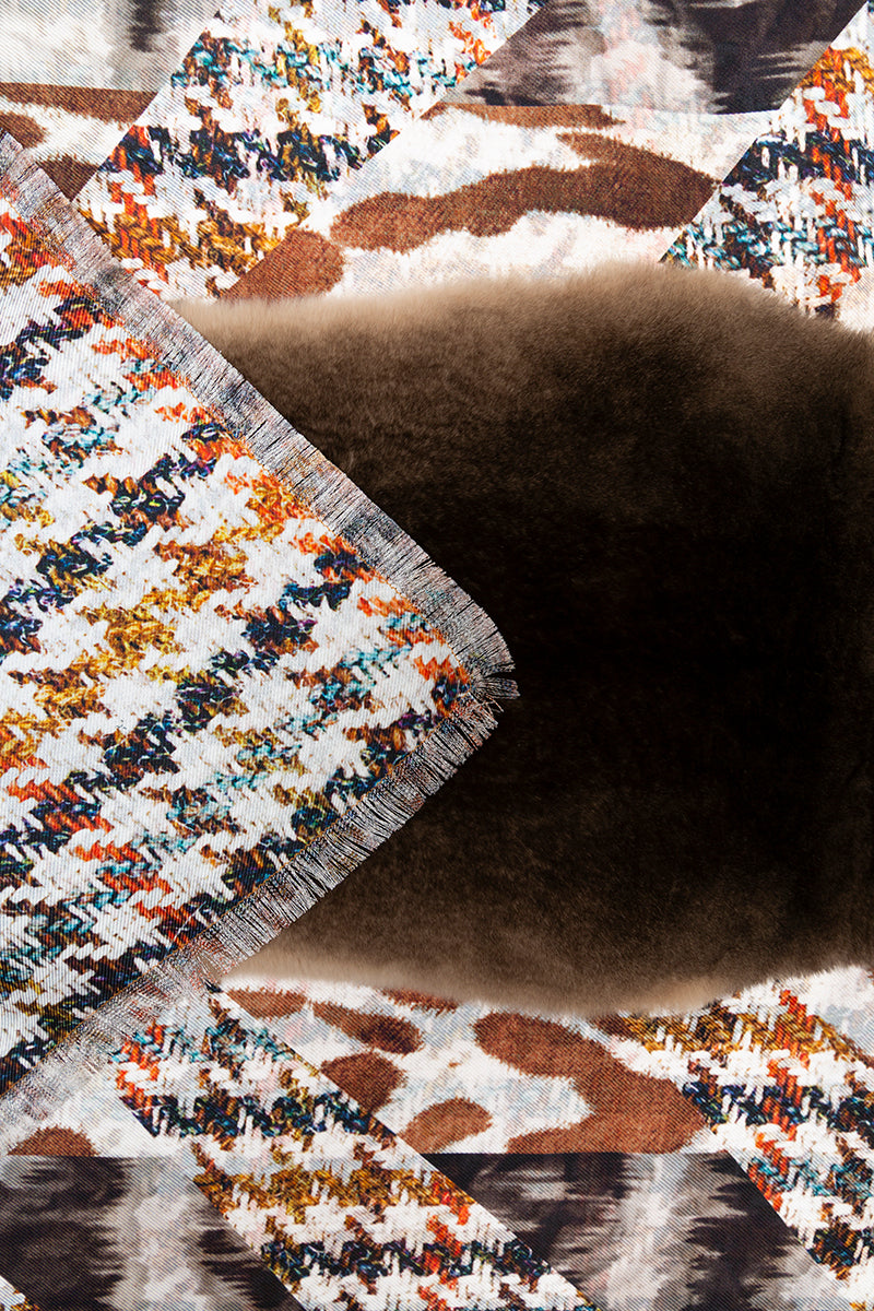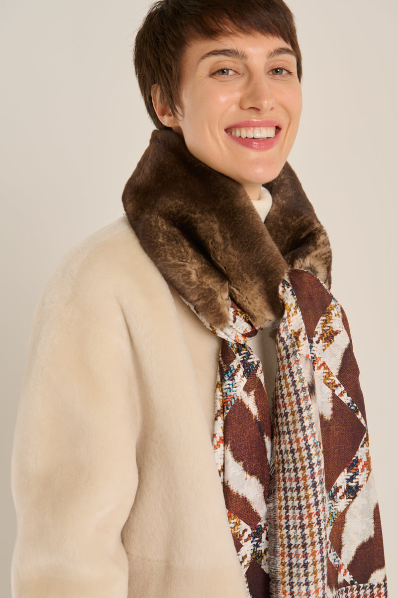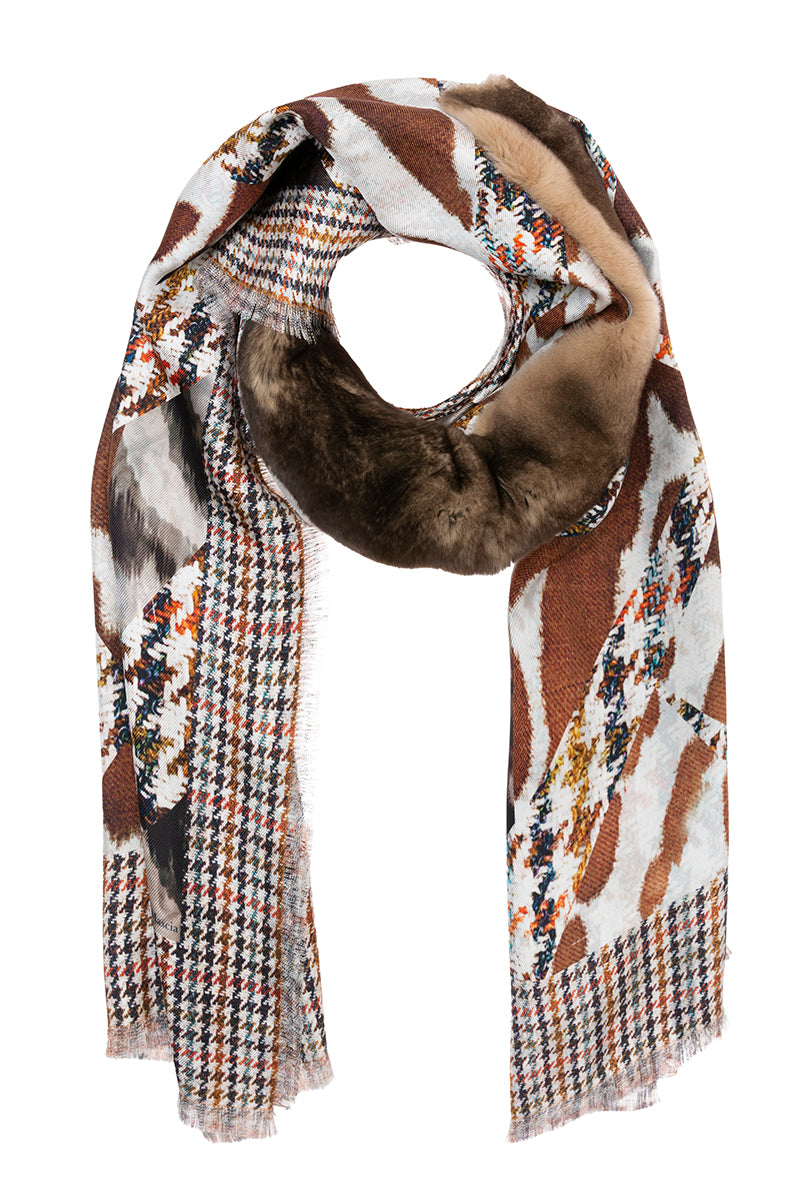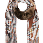 Pañuelo de la firma Pierre-Loius Mascia en seda natural 100%. Estampado de doble cara contrasta por un lado con estampado geométrico en pata de gallo en tonos blanco, marrón y azul, y por el otro, ese mismo estampado intercalado con bandas de animal print en tonos blanco y marrón. Pieza central en piel ORYLAG en color natural. Remate fleco pequeño. Tamaño: 65 x 90 cm. Composición: 100 % seda, 100% ORYLAG. Hecho en Italia.