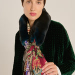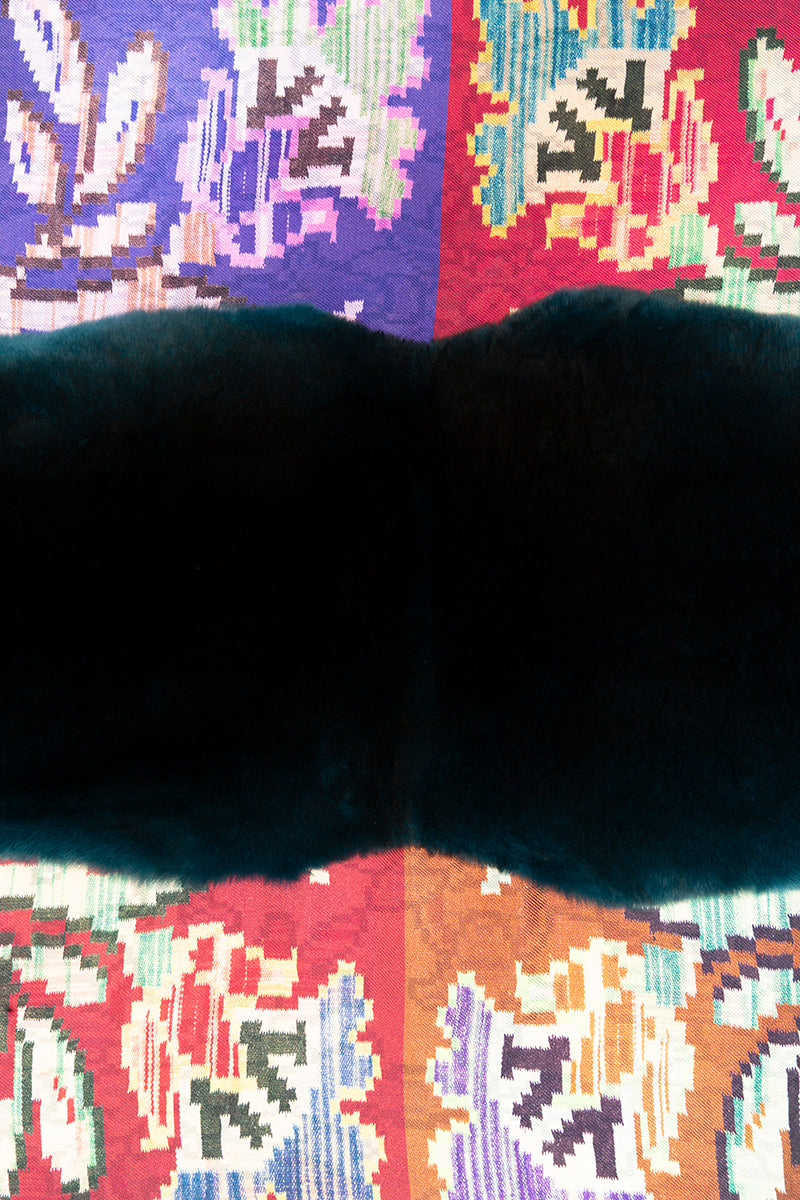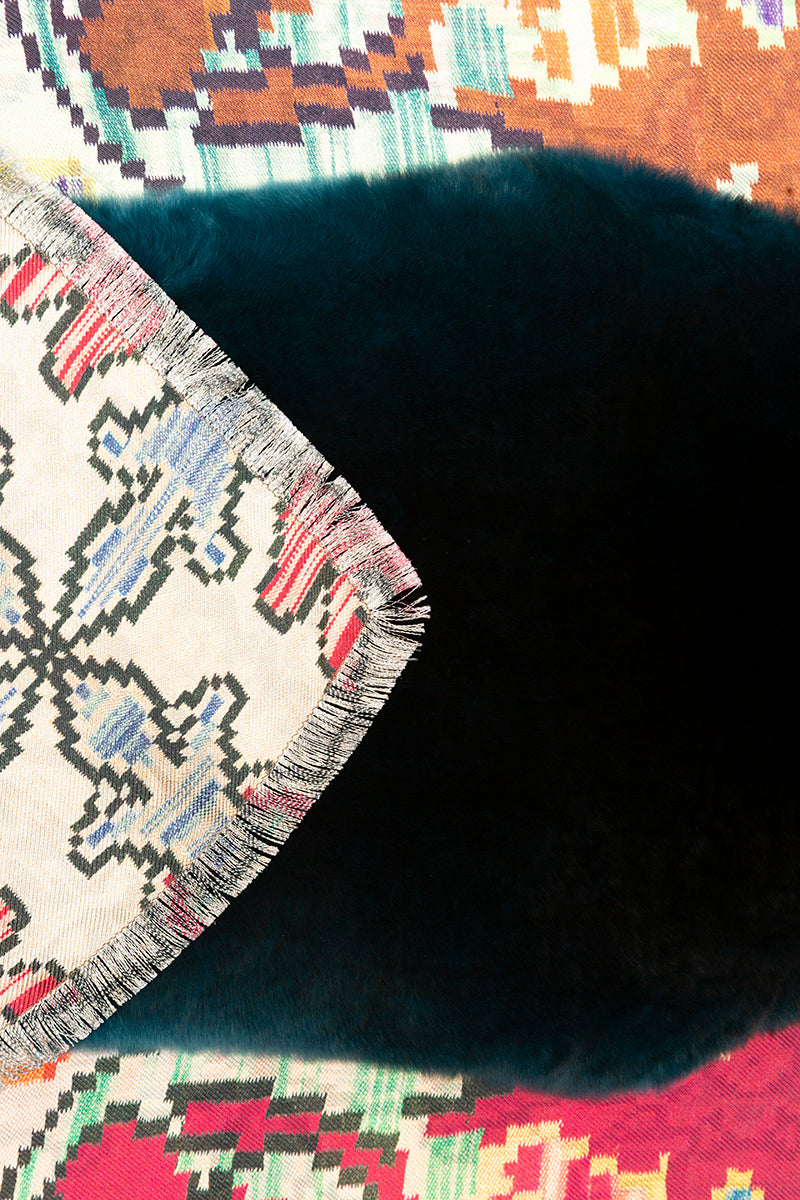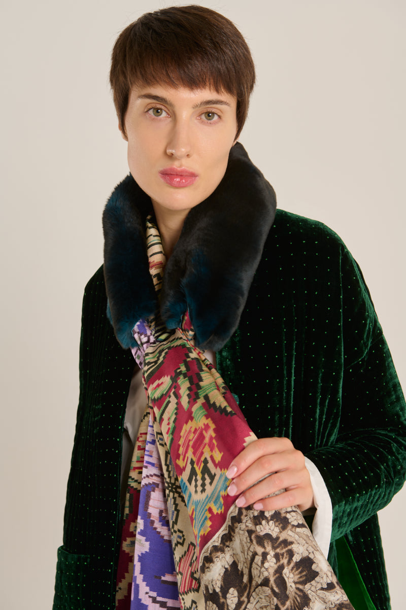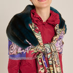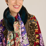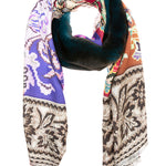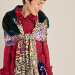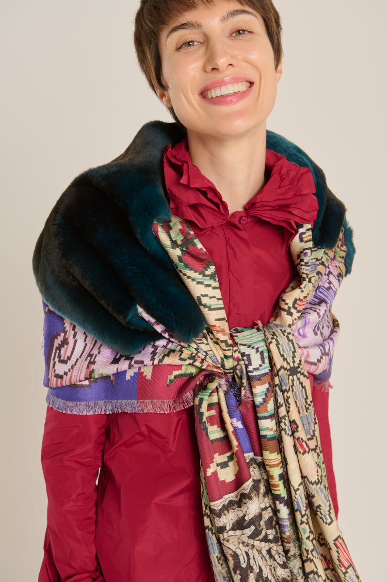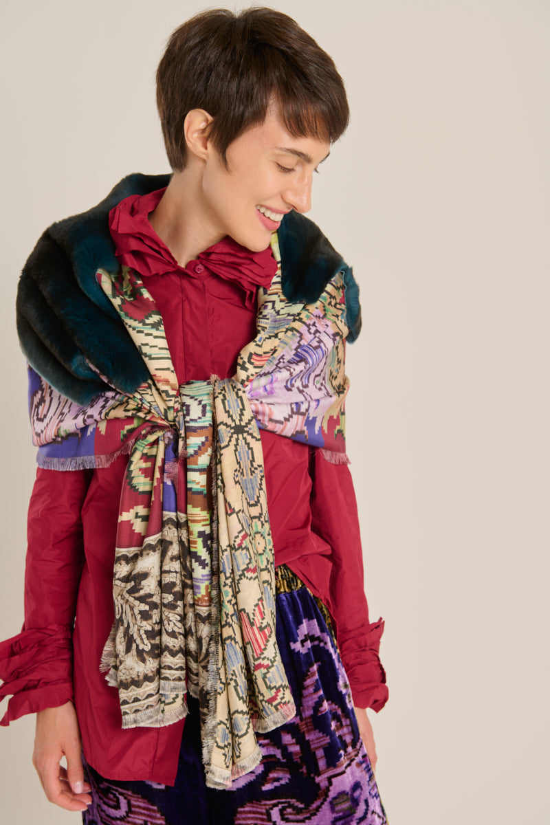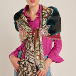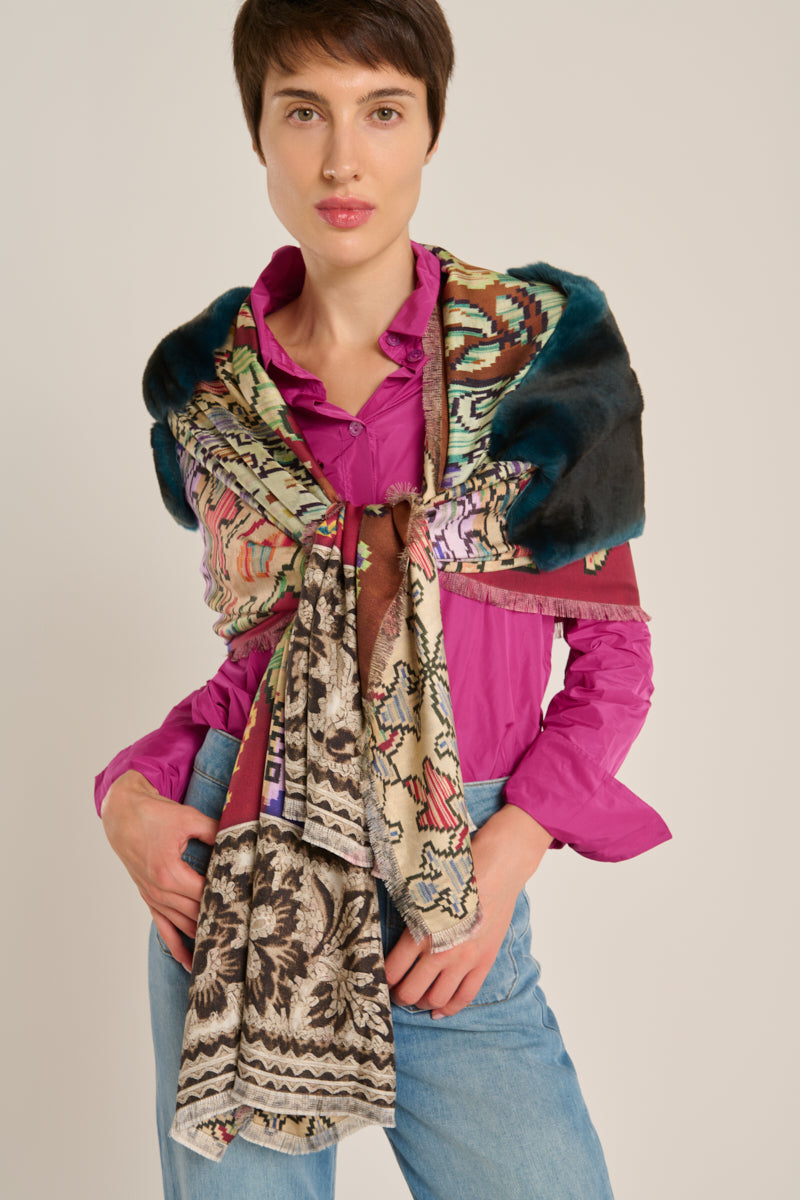 Pañuelo de la firma Pierre-Loius Mascia en seda natural 100%. Estampado doble cara contrasta por un lado con estampado de estilo persa enmarcado entre dos cenefas en tonos grana, malva, verde, marrón y ocre, por el otro lado, con un patrón geométrico floral en tonos grana, verde, azul y marrón sobre fondo beige. Pieza central en piel ORYLAG en color petróleo. Remate fleco pequeño. Tamaño: 65 x 90 cm. Composición: 100 % seda, 100% ORYLAG. Hecho en Italia.