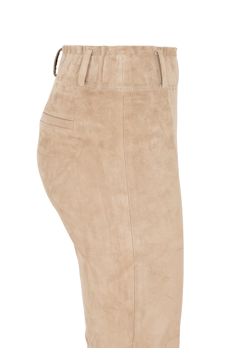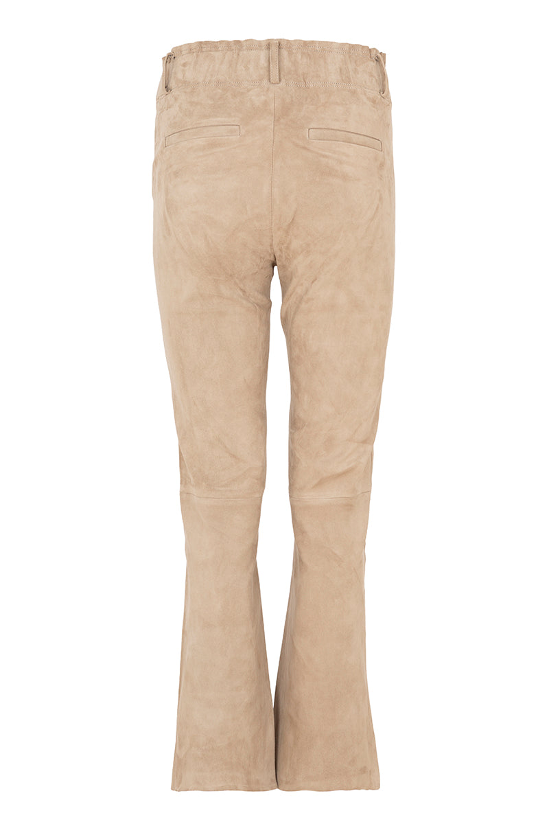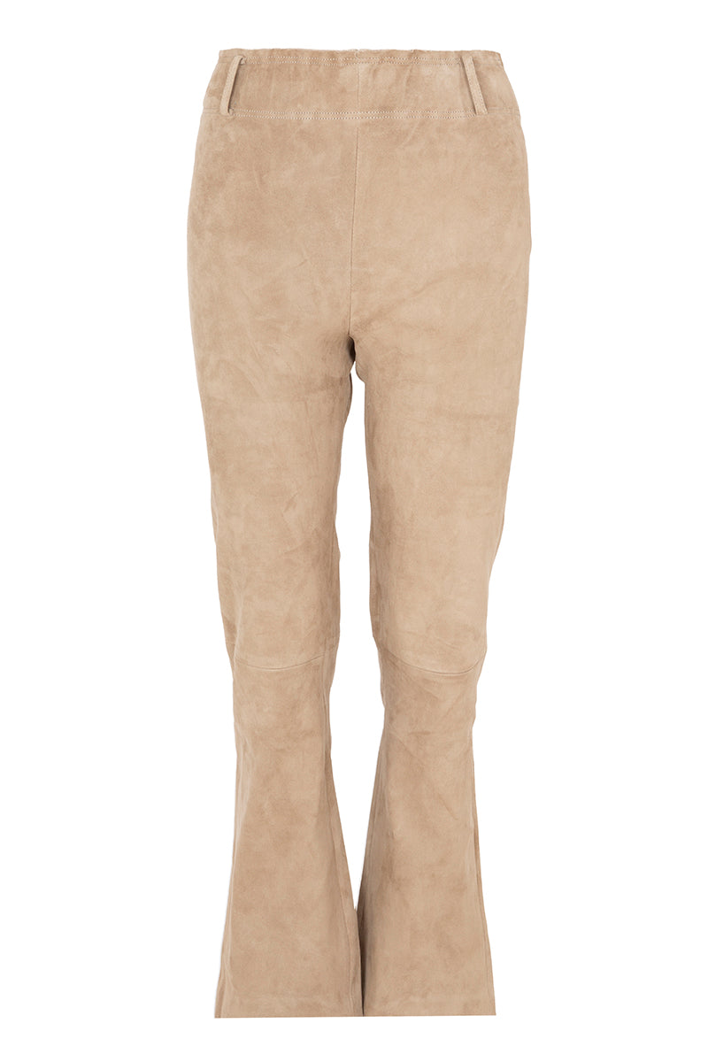 Pantalón stretch, de ante lavable, de la marca holandesa Arma. Modelo flare de tiro alto en color topo. Cintura elástica con trabillas para cinturón y falsos bolsillos traseros. Composición: 97% piel de cordero ,3% elastán. Tallaje alemán.