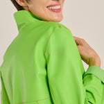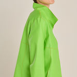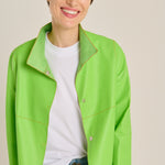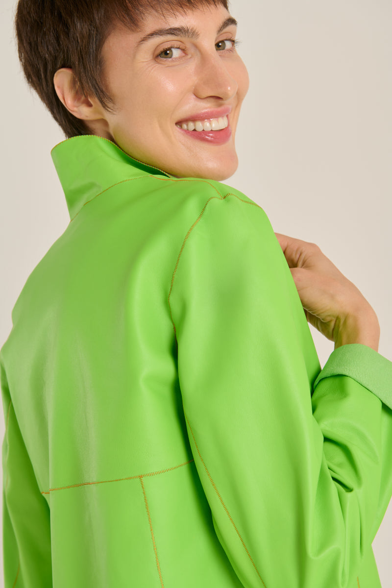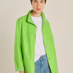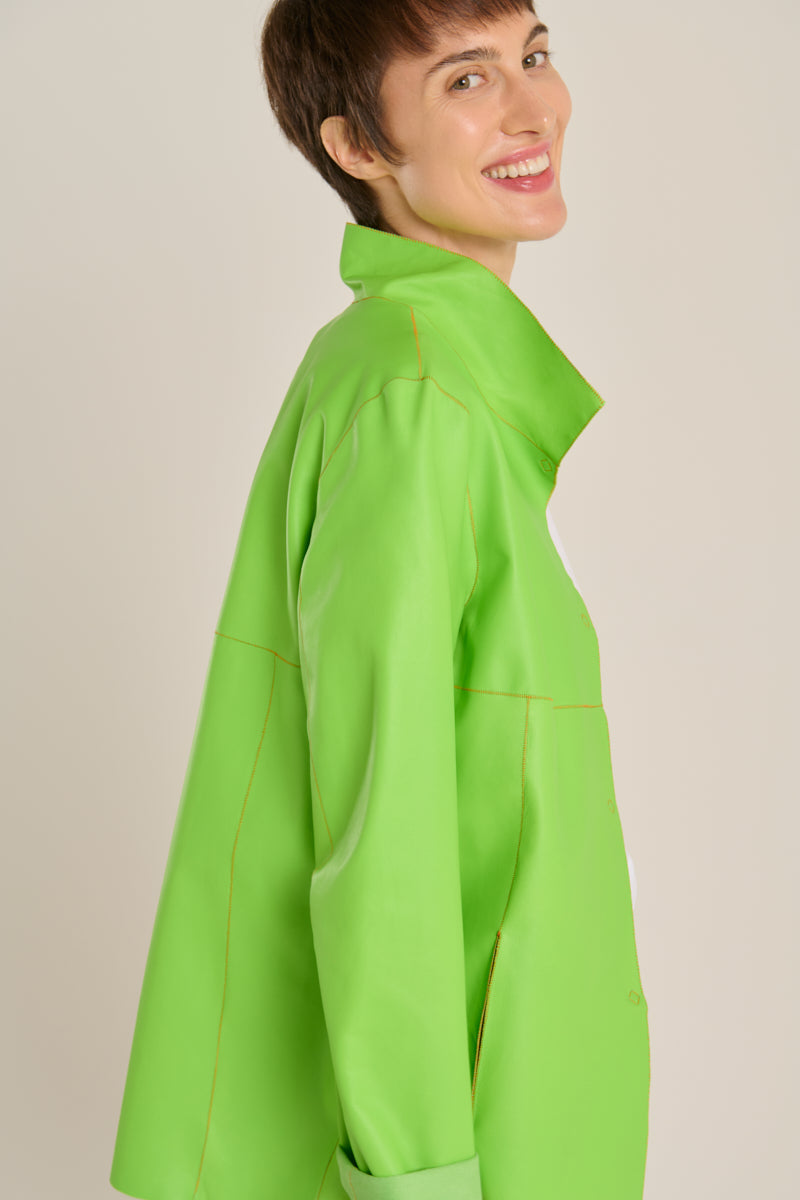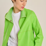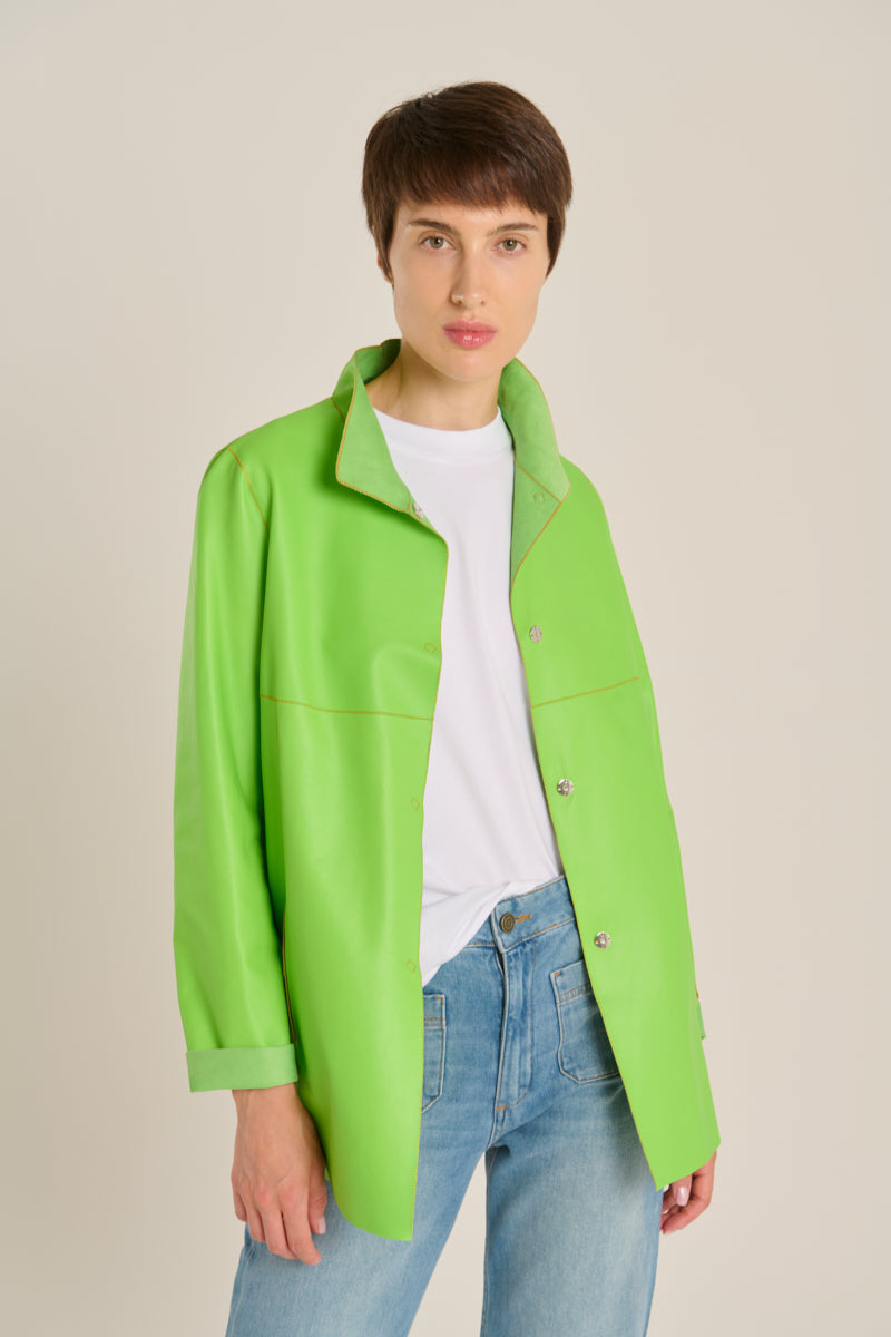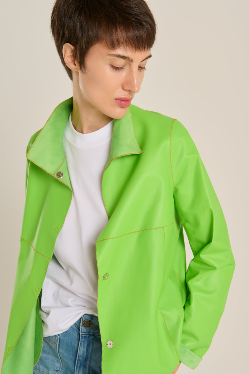 Levita de piel de cordero español acabado en napa, con cuello camisa. Color verde lima y detalle de hilo en tono naranja. Cierre con botones automáticos. Composición: 100% Cordero español. Fabricado en España.