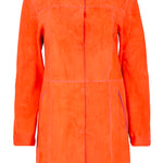 Levita de piel de cordero español acabado en ante , sin cuello. Color coral y detalle de hilo en tono morado. Cierre con botones automáticos. Composición: 100% Cordero español. Fabricado en España.