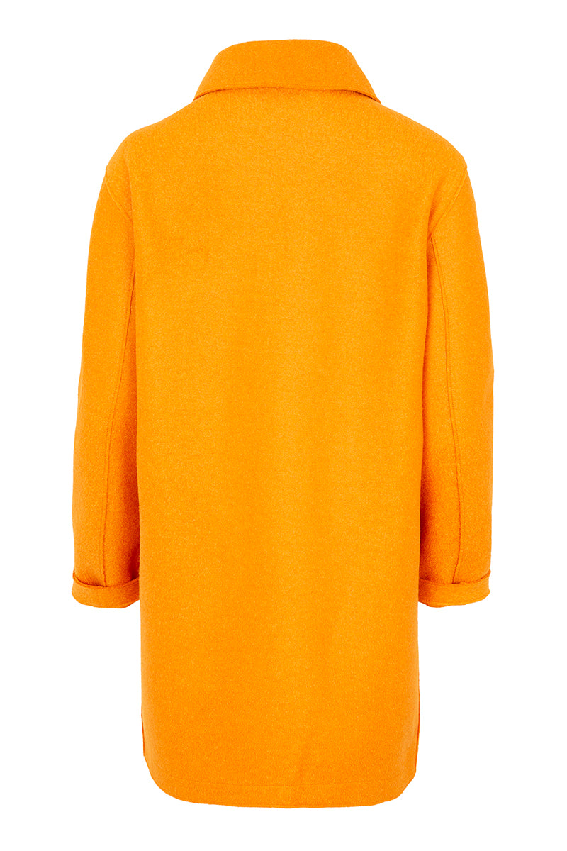 Abrigo recto de paño con cuello camisero, color mandarina con bolsillos frontales y cierre con 4 botones. Composición: 100% lana virgen. Tallaje italiano. Hecho en Italia.