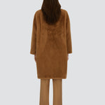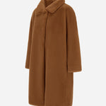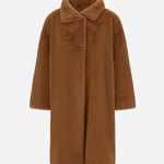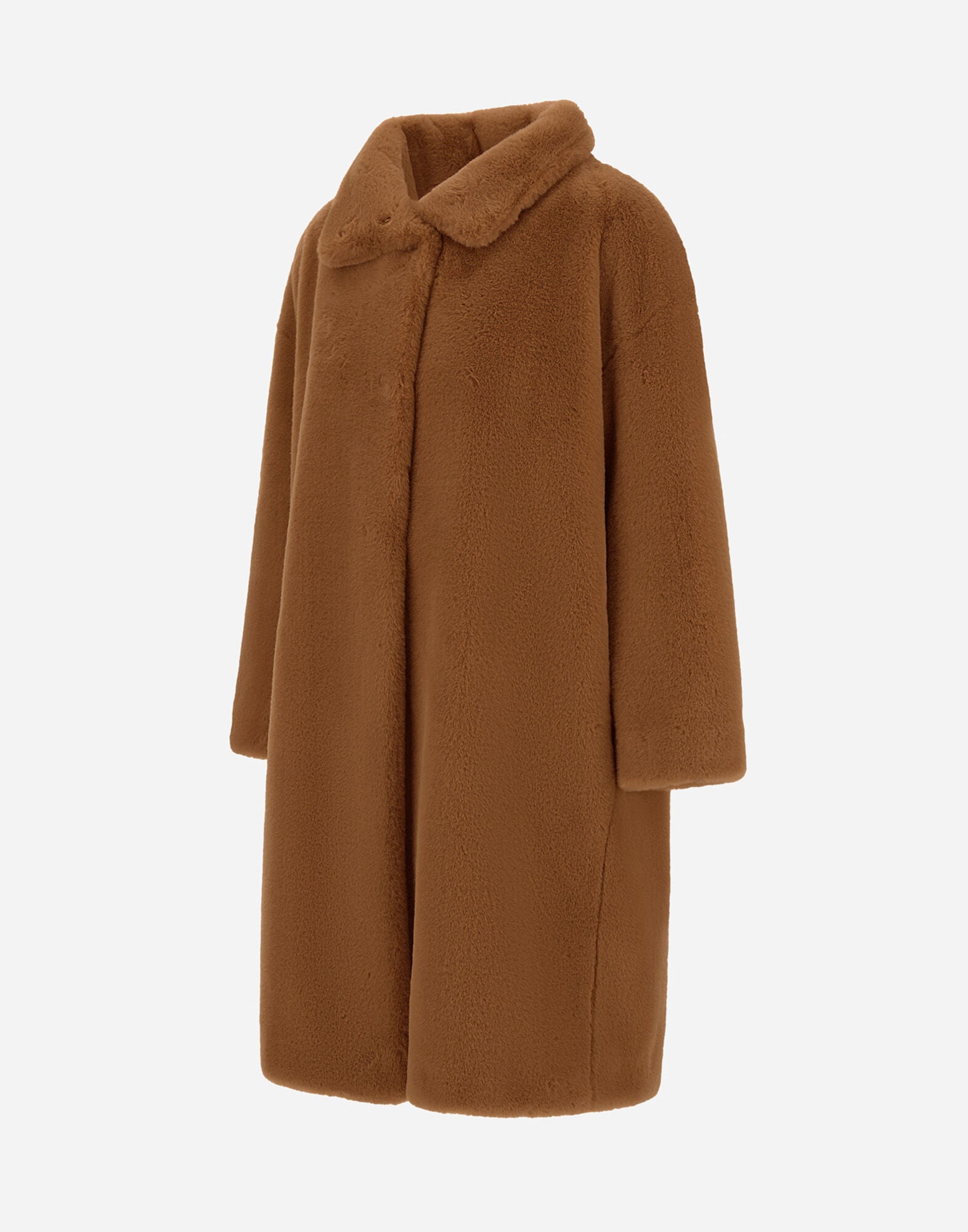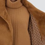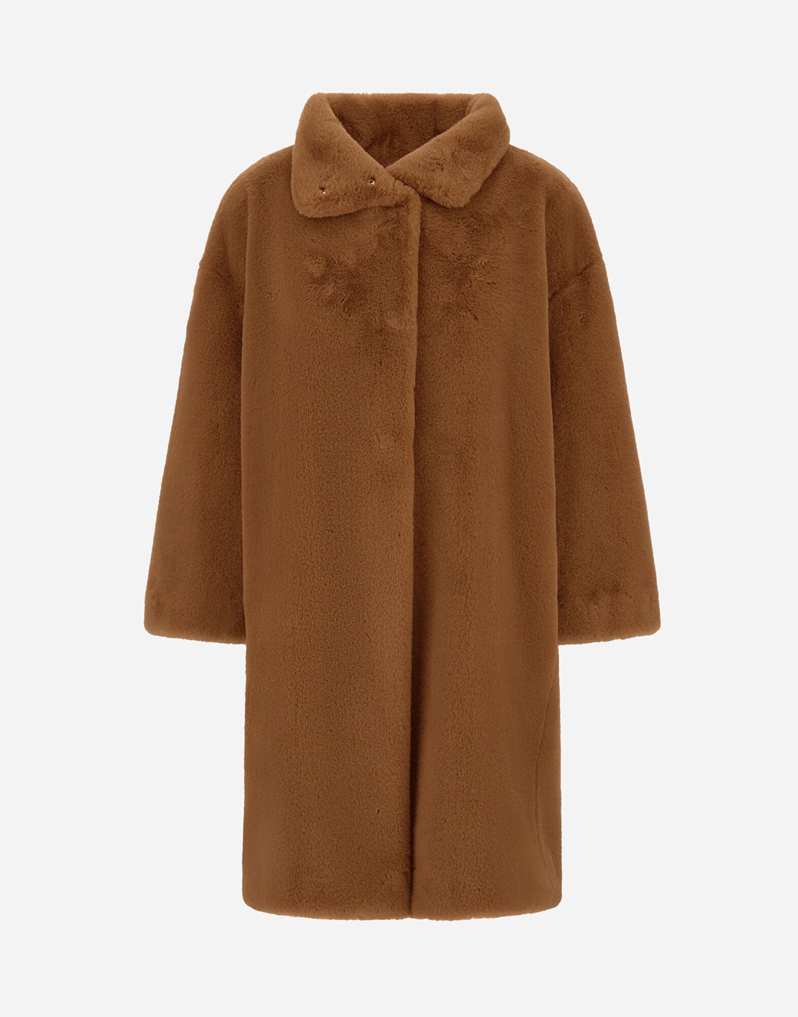 Abrigo de pelo de la marca Herno, con corte oversize, cuello alto, manga caída y cierre delantero de corchetes, confeccionado en visón ecológico de color camel y forro logotipado en contrataste en tonos tierra. Composición: exterior, 100% poliéster, interior, 100% poliéster. GC000491D-12422-2157 CAMMELLO