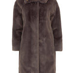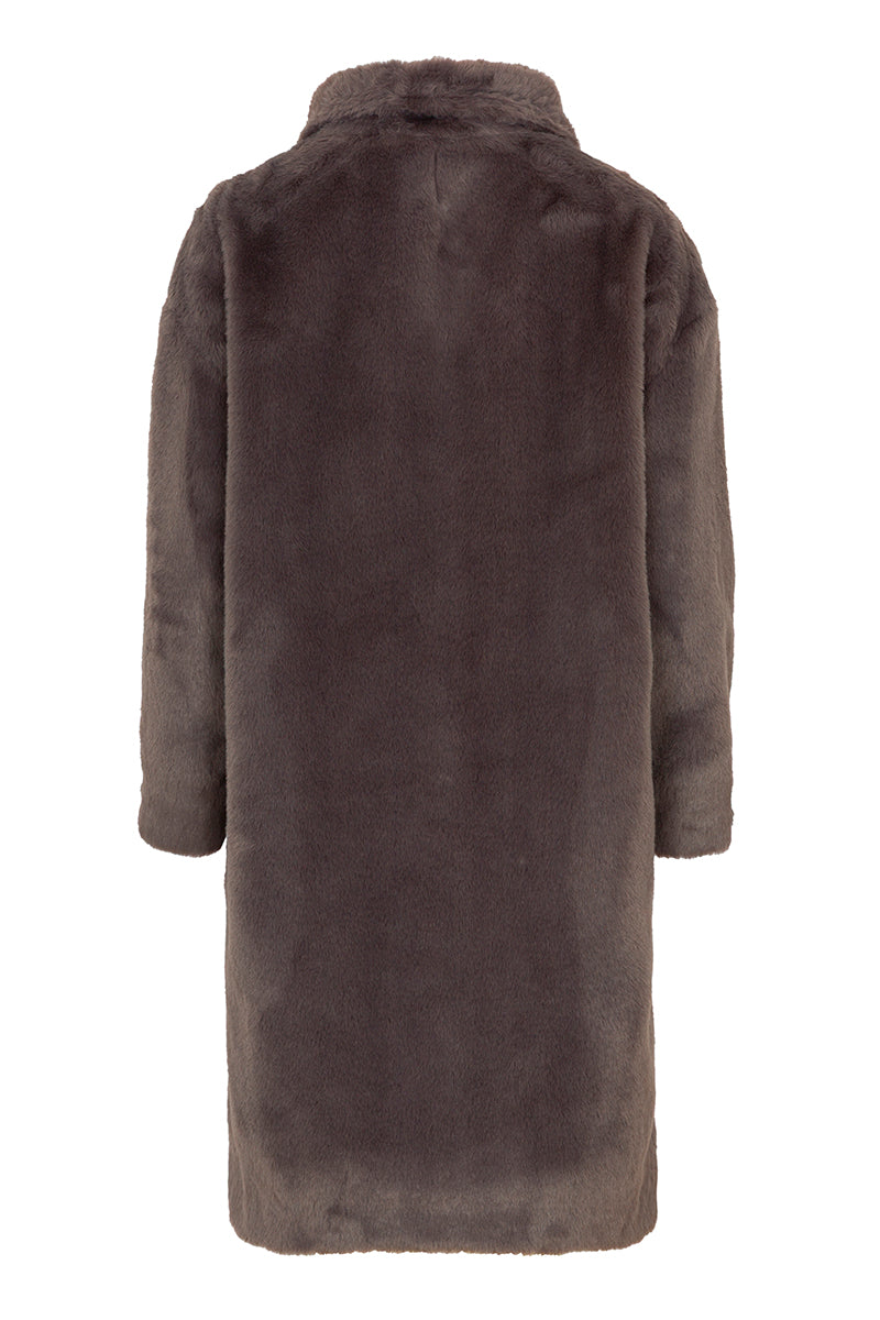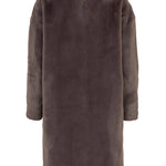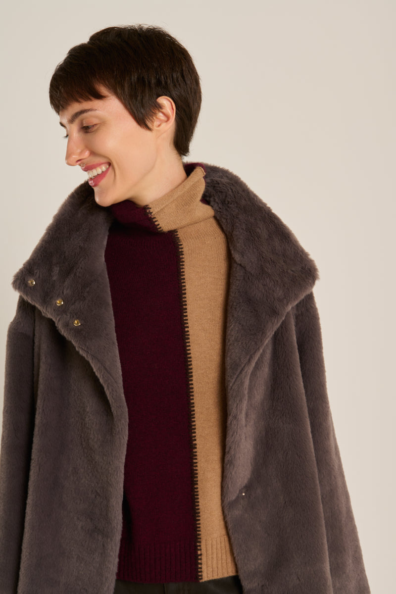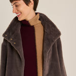 Abrigo de pelo de la marca Herno, con corte oversize, cuello alto, manga caída y cierre delantero de corchetes, confeccionado en visón ecológico de color grafito y forro logotipado en contrataste en tonos tierra. Composición: exterior, 100% poliéster, interior, 100% poliéster. GC000491D. Tallaje italiano.