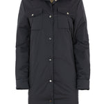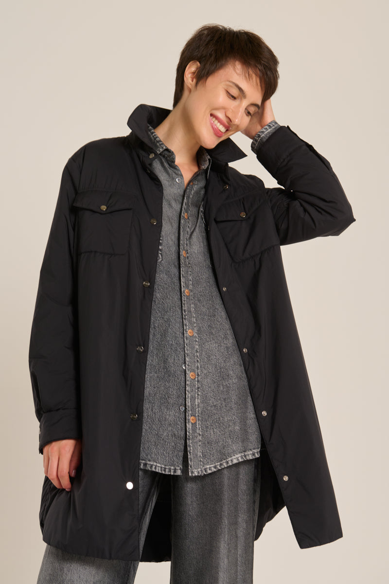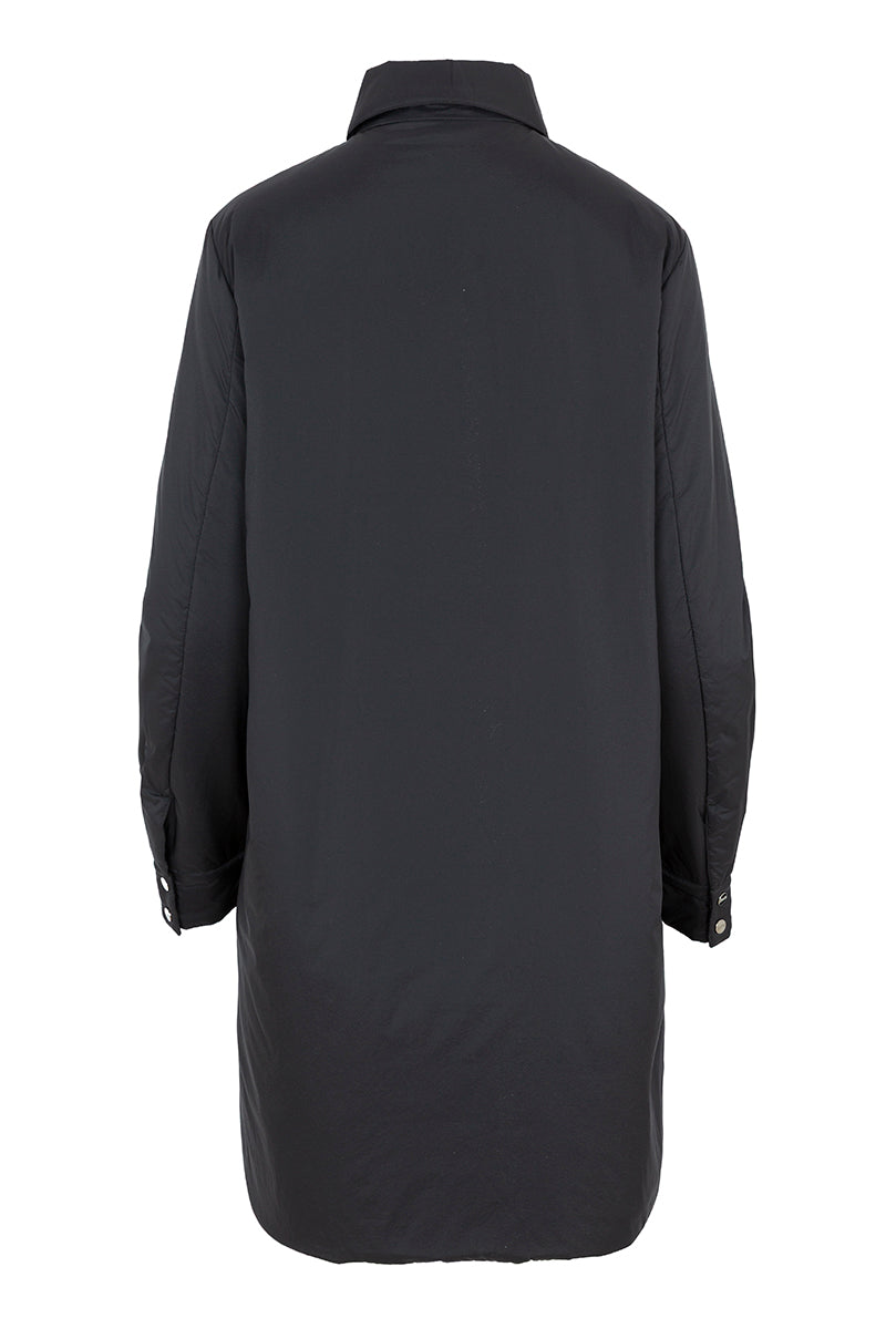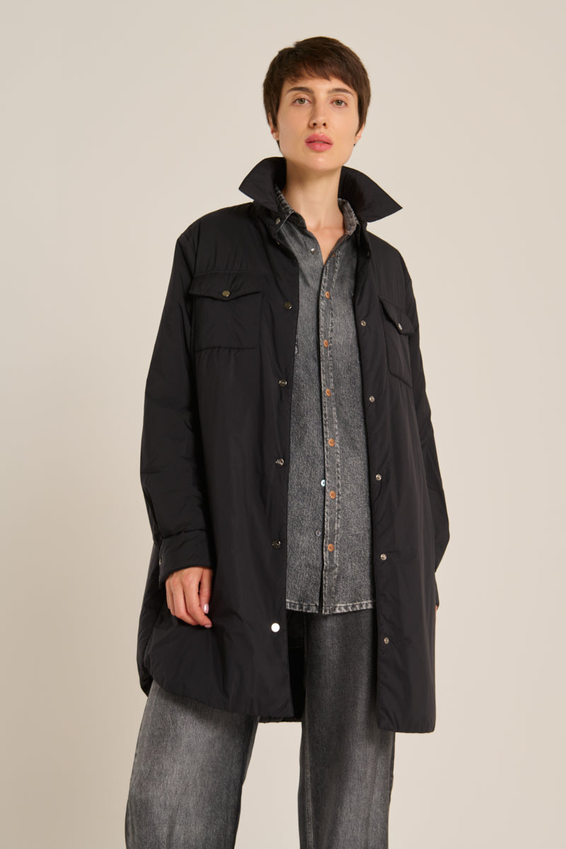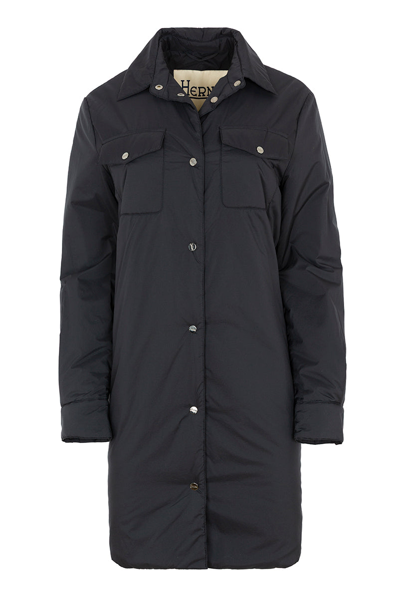 Plumino de ganso color negro. Patrón recto, largo, extraligero. Cierre con corchetes y detalle de bolsillo delanteros con tapeta. Línea de Herno «Globe Lab», impermeable y ultralight. Composición: 100% Polyamide. Tallaje italiano. Ref: GC000534D-12456Z-9300