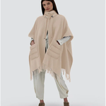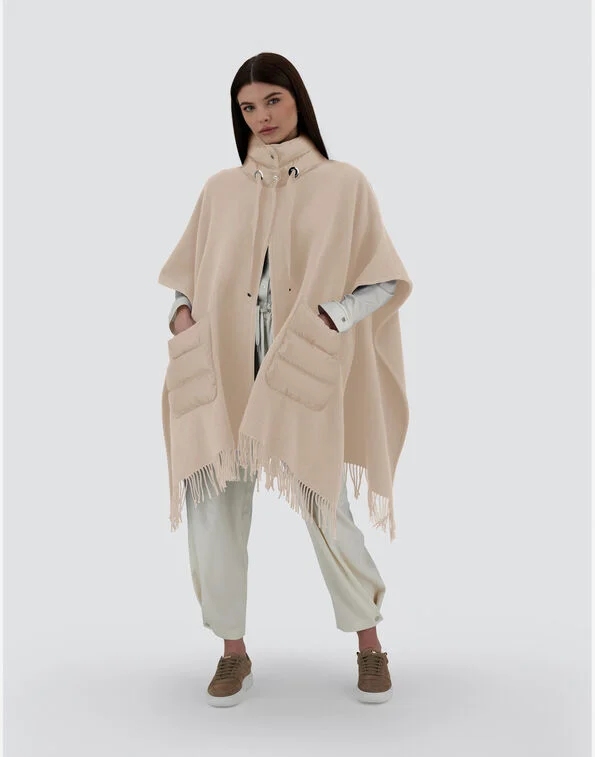 Poncho oversize de la marca Herno de la línea Resort. Color crudo, bolsillos frontales y cuello y en acolchado al tono . Acabado con flecos . Composición 1: 90% lana, 10% cashmere. Composición 2: 90% Plumón, 10% Pluma.Talla única. Fabricado en Italia. Ref: GC00066DR-33395-1982