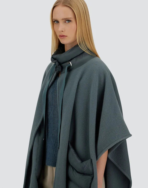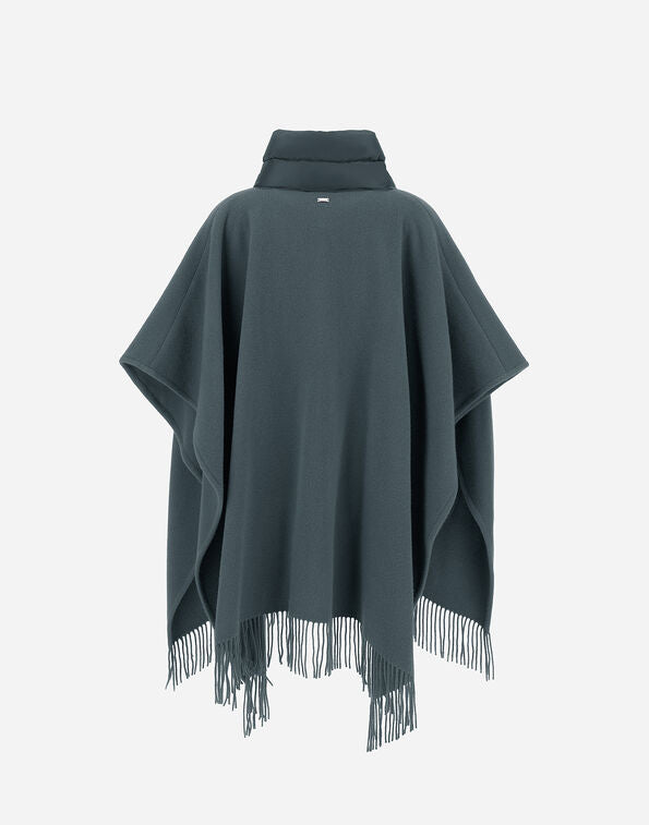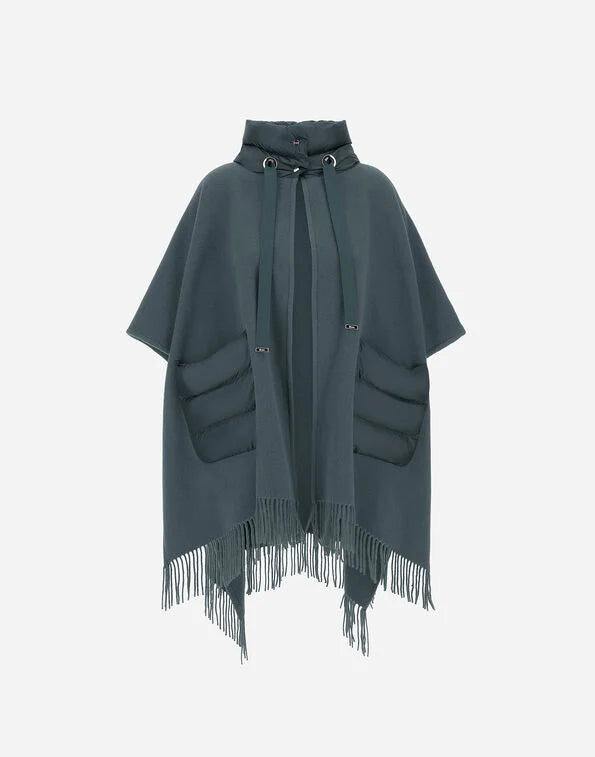Poncho oversize de la marca Herno de la línea Resort. Color azul verdoso, bolsillos frontales y cuello y en acolchado al tono . Acabado con flecos . Composición 1: 90% lana, 10% cashmere. Composición 2: 90% Plumón, 10% Pluma.Talla única. Fabricado en Italia. Ref: GC00066DR333959123