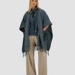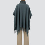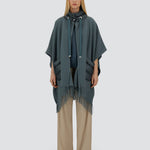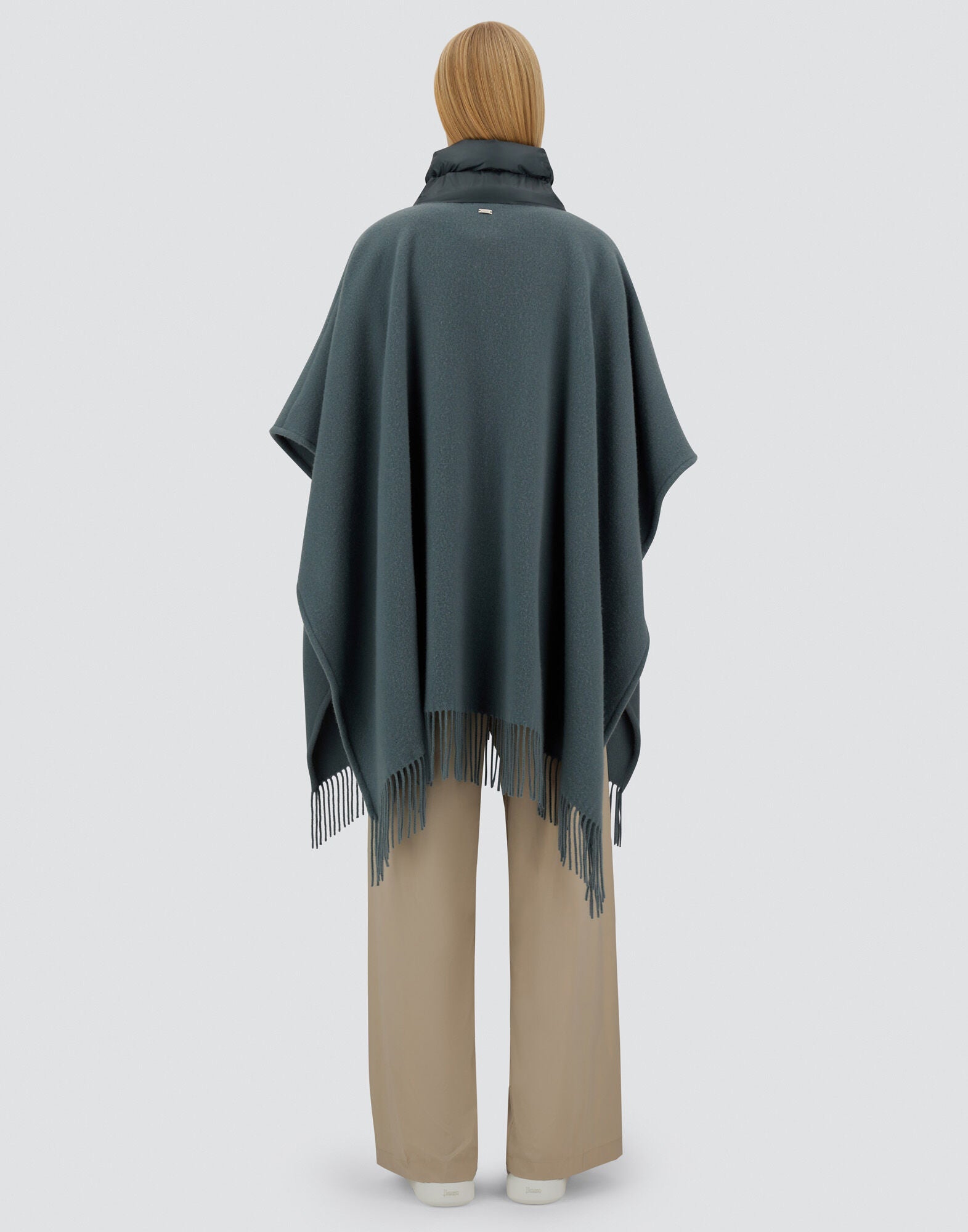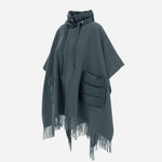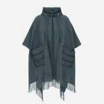 Poncho oversize de la marca Herno de la línea Resort. Color azul verdoso, bolsillos frontales y cuello y en acolchado al tono. Acabado con flecos. Composición 1: 90% lana, 10% cashmere. Composición 2: 90% Plumón, 10% Pluma. Talla única. Fabricado en Italia. Ref: GC00066DR333959123