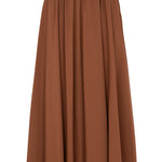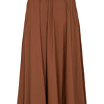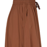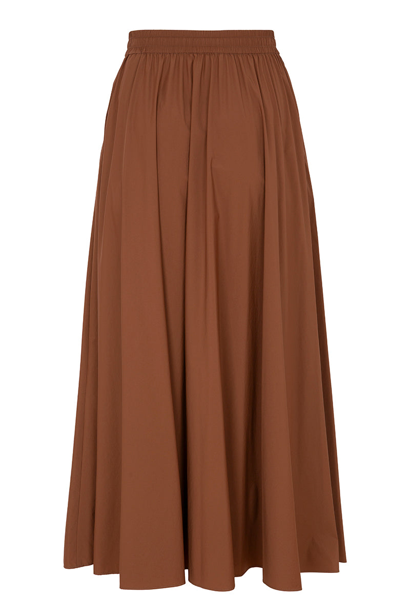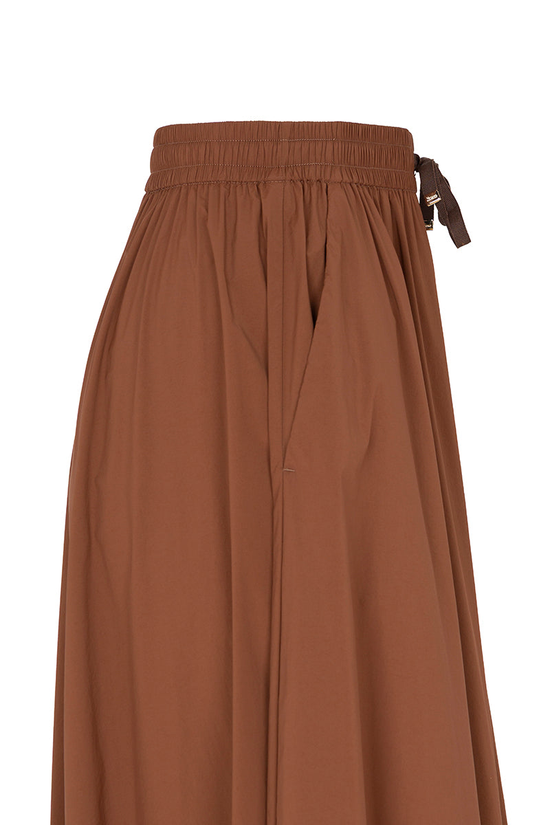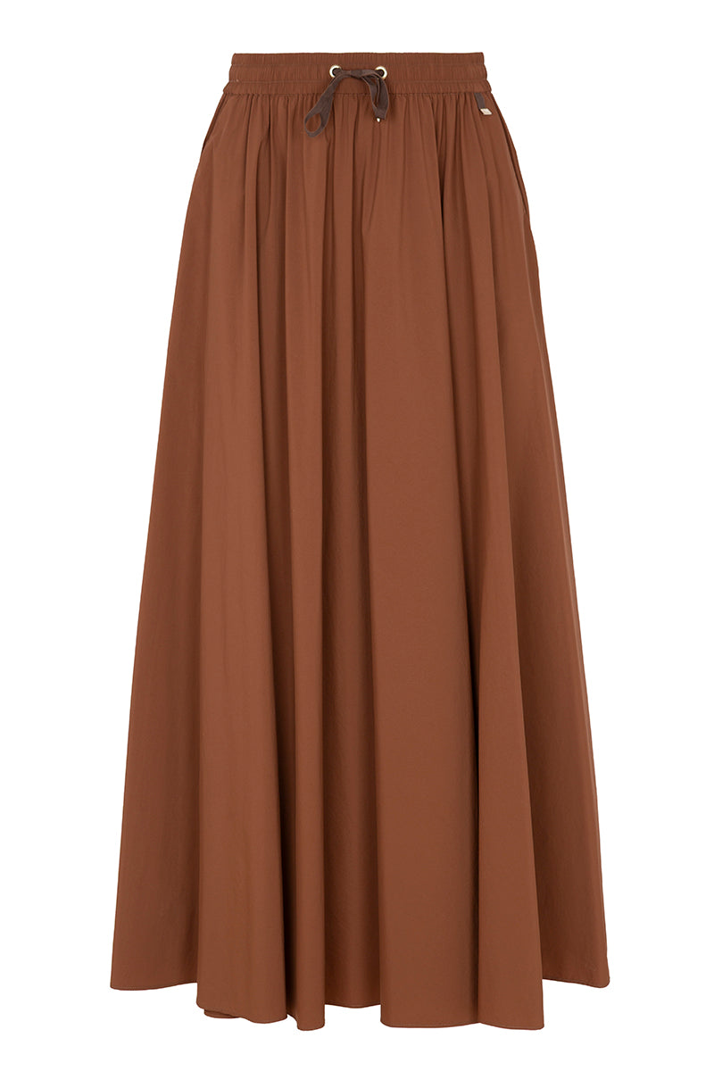 Falda midi de la firma italiana Herno en fino tejido técnico .Cintura elástica con cordón ajustable, corte capa y bolsillos laterales. Color marrón . Composición: 86% poliamida 14% elastan . Tallaje italiano