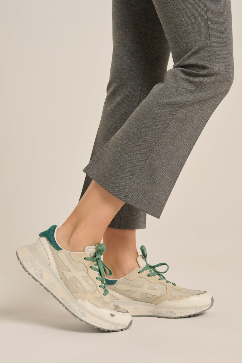 Zapatilla Hill, variante 7854. Tejido exterior en nylon en color azul maino, morado y verde con logo y talonera en ante al tono. Cordón en algodón en morado. Suela extra confort.