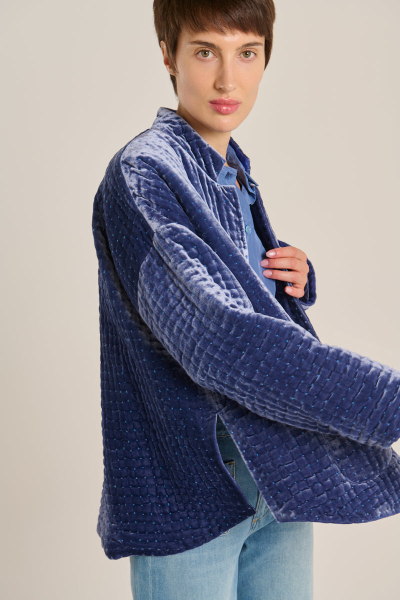 Chaqueta guateada de terciopelo con pequeños bodoques bordados en azul claro . Cuello camisero invertido, Bolsillos de plastrón delanteros , aberturas laterales y bajo redondeado . Color azul con forro a contraste en diferente azul .Composición: 78% viscosa, 22% seda .