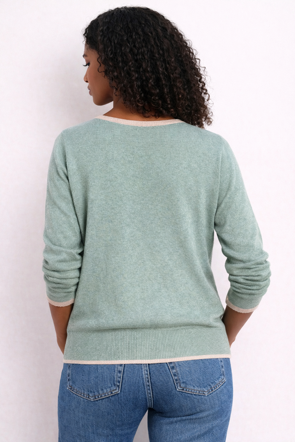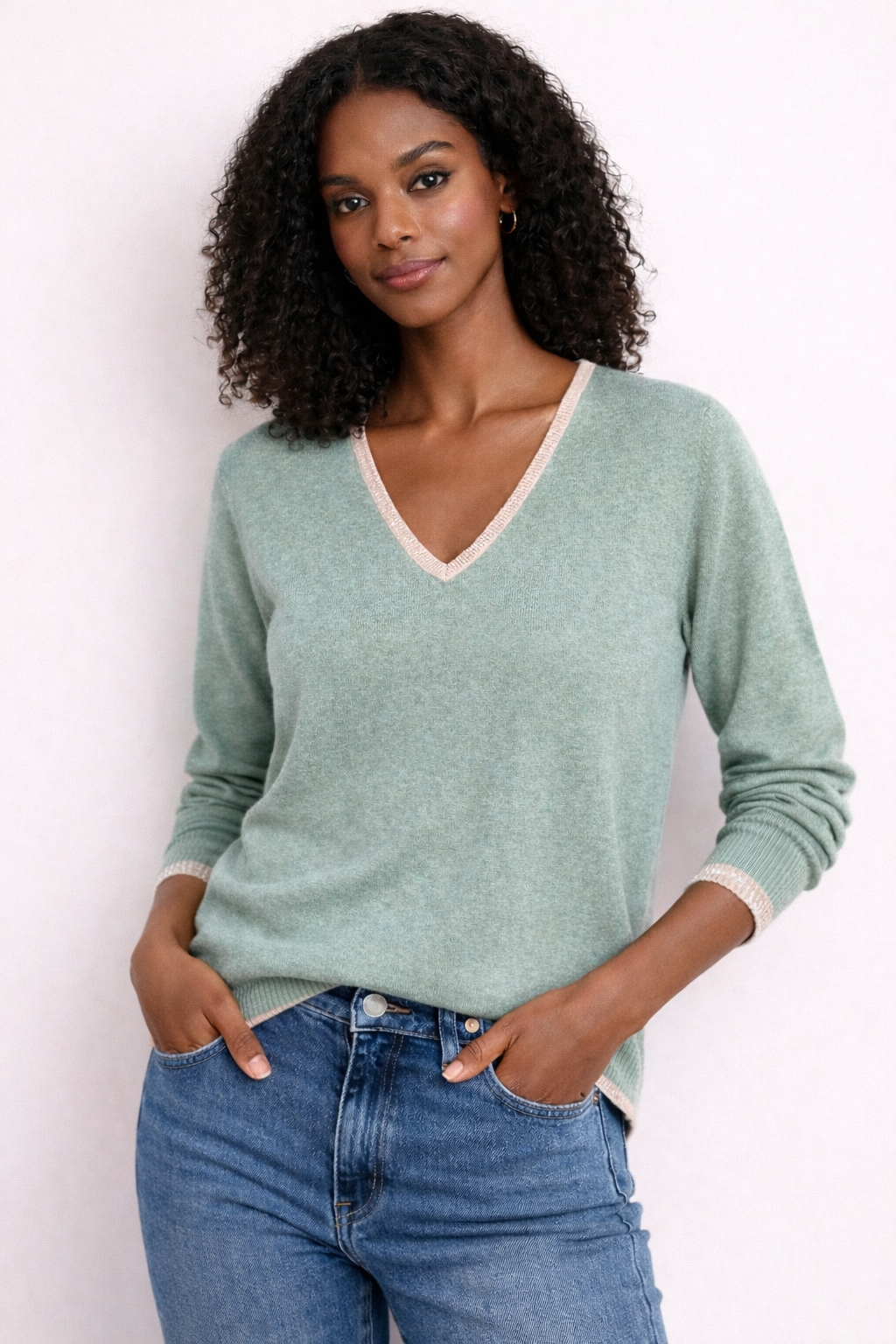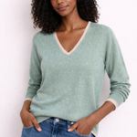 Jersey en color verde, escote pico y aberturas laterales. Detalle en lurex en escote, puños y bajo. Composición: 95% algodón, 4% cashmere, 1% hilo metálico.