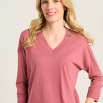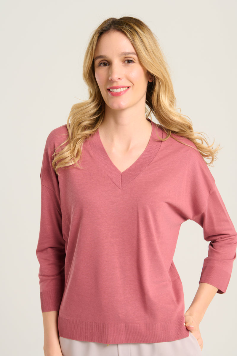 Jersey de pico de la firma italiana Herno con manga francesa , corte recto y aberturas laterales. Color rosa viejo . Composición : 67% lyocell, 33% algodón. Tallaje italiano.