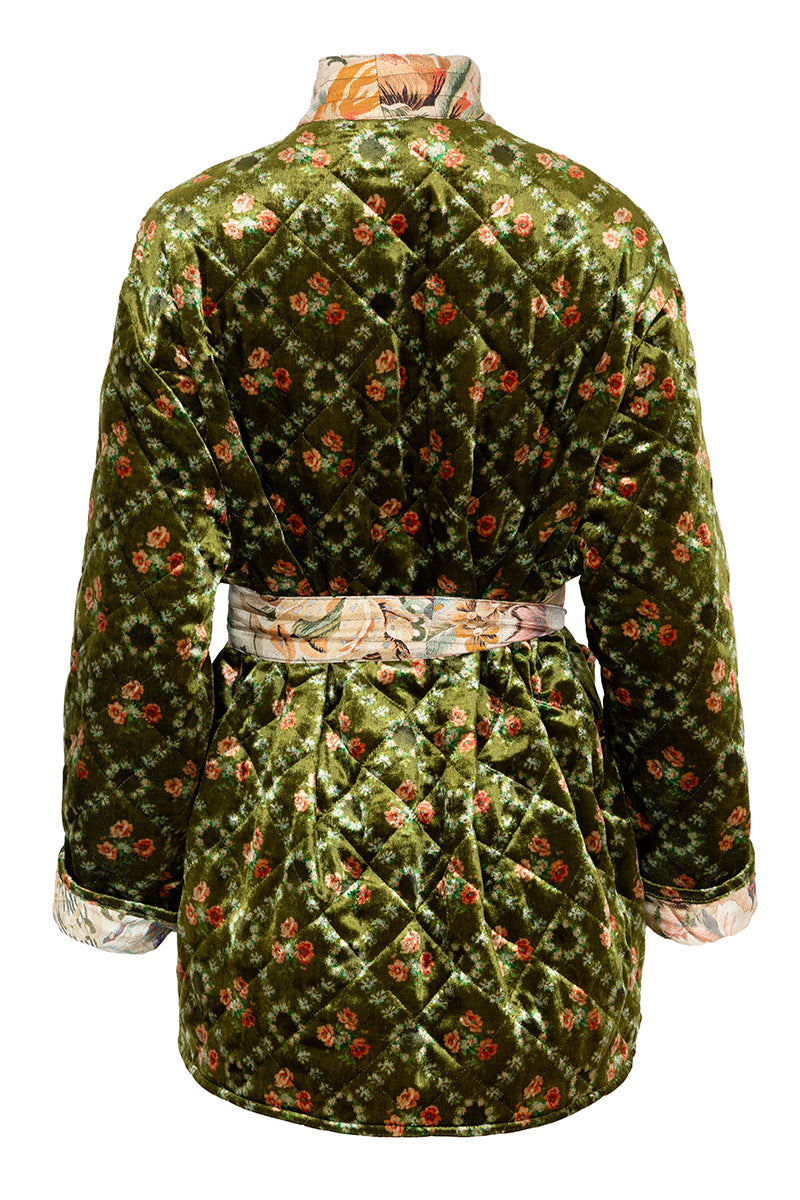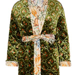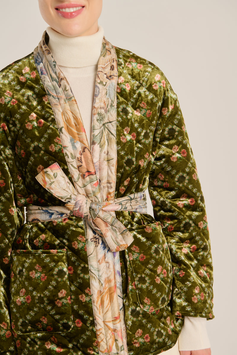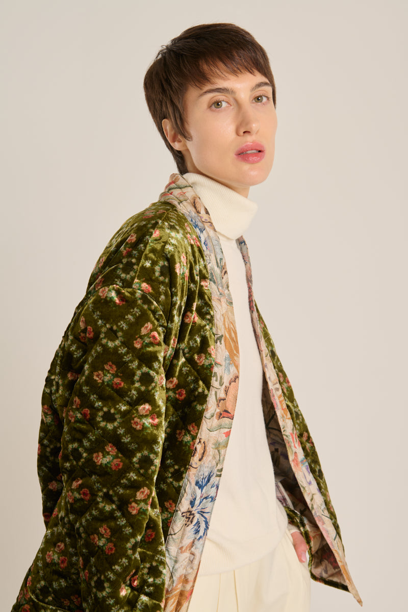 Kimono en terciopelo guateado con bolsillos de plastrón inferiores y estampado de flores liberty sobre fondo verde, contraste de flores estampadas en seda en el forro, borde y cinturón de la prenda. Composición, ext.:82% viscosa, 18% seda, forro: 100% seda. Hecho en Italia. Tallaje Italiano.