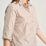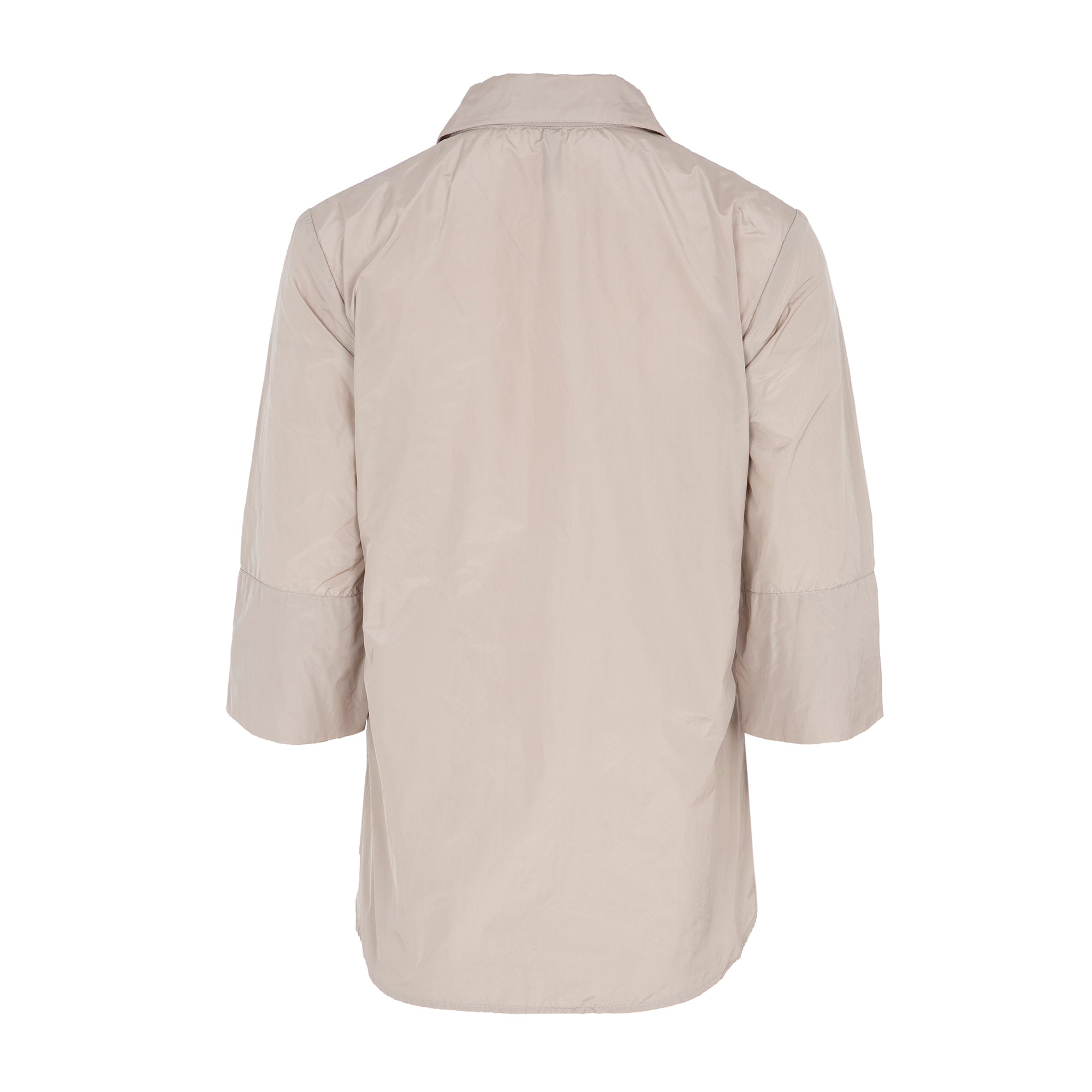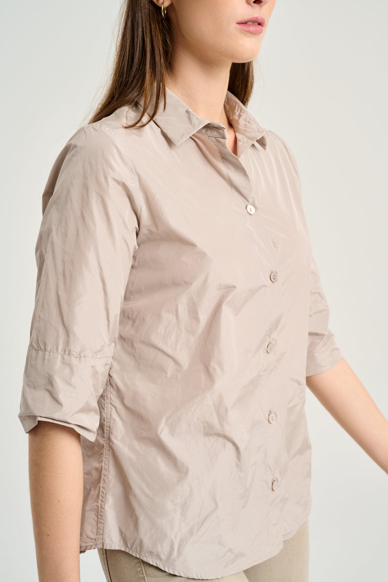 Camisa de tejido tecnológico recta con cuello camisero, botones al tono y manga 3/4. Color piedra. Composición: 100% Poliéster. Este tejido no se puede planchar. Tallaje alemán.