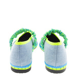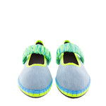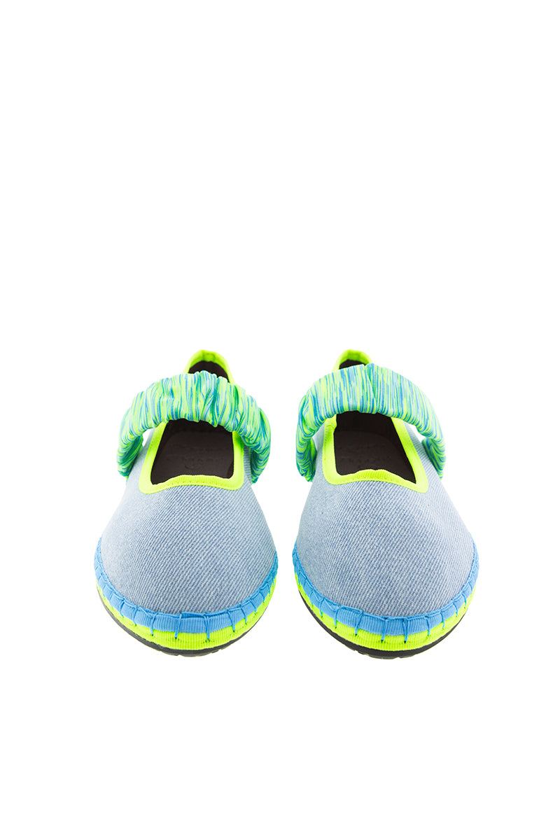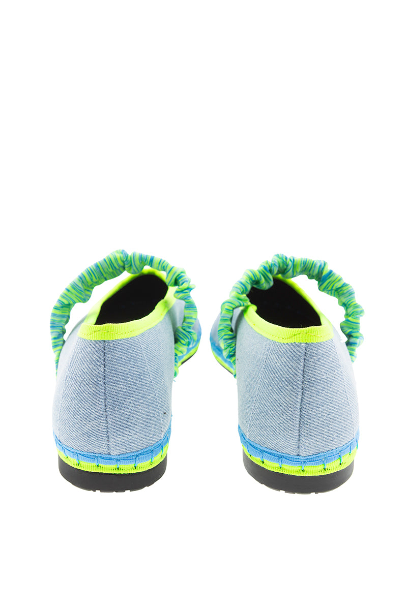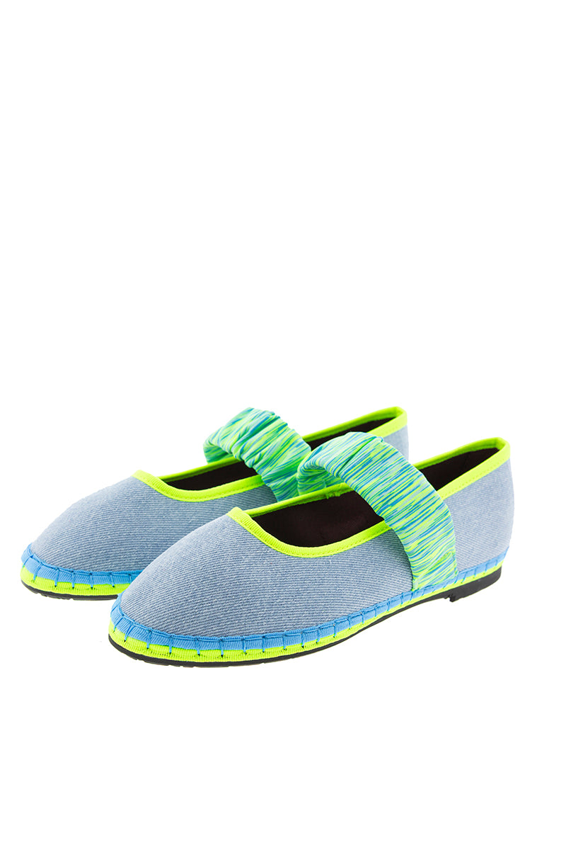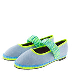 Bailarina Mafalda en tejano de algodón de la colección cápsula creada para Alfaro 1926, de la firma española Flabelus. Diseño con escote redondo y cinta elástica en neopreno en tonos cítricos sobre el empeine. Color tejano y pespunte en azul jean con remates de grosgrain y suela en amarillo flúor y azul. Composición: exterior 100% lino, interior 100% algodón orgánico y la suela está hecha de caucho producido a partir de neumáticos de bicicleta reciclados. Tratamiento antibacteriano. Si dudas entre dos tallas coged siempre el mayor.