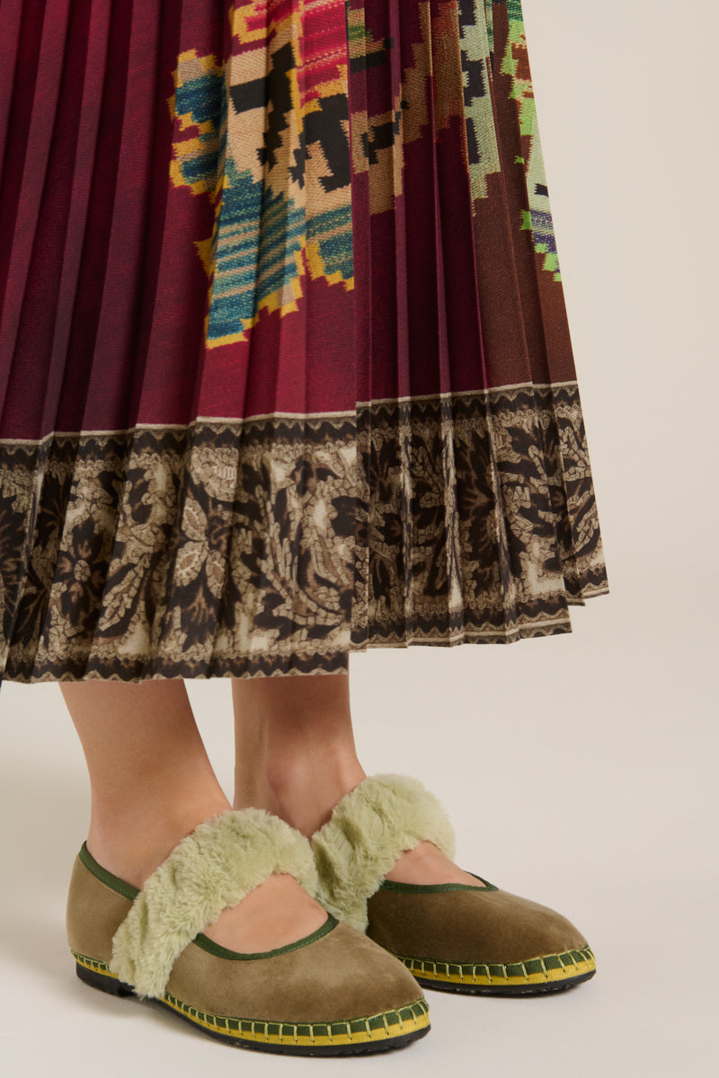 Bailarina Mafalda en terciopelo de algodón de la colección cápsula creada para Alfaro 1926, de la firma española Flabelus. Diseño con escote redondo y cinta elástica en ecofur en verde agua sobre el empeine. Color verde kaki y pespunte en verde con remates de grosgrain y suela en mostaza y verde loden. Composición: exterior 100% terciopelo de algodón, interior 100% algodón orgánico y la suela está hecha de caucho producido a partir de neumáticos de bicicleta reciclados. Tratamiento antibacteriano. Si dudas entre dos tallas coged siempre el mayor.