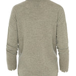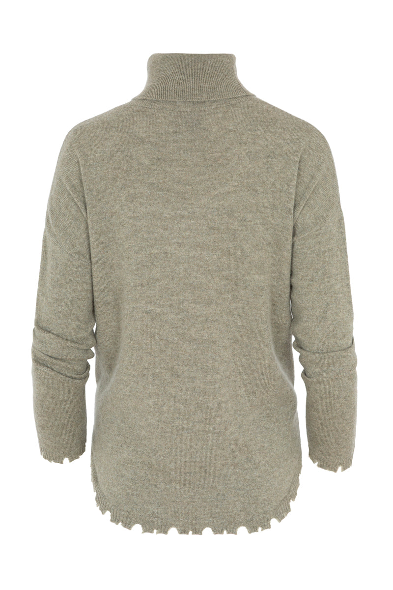 Jersey cuello cuello vuelto, de la marca francesa Kujten, color kaki, bajo redondeado con acabado efecto desgastado . Composición: 100% Cachemere.