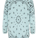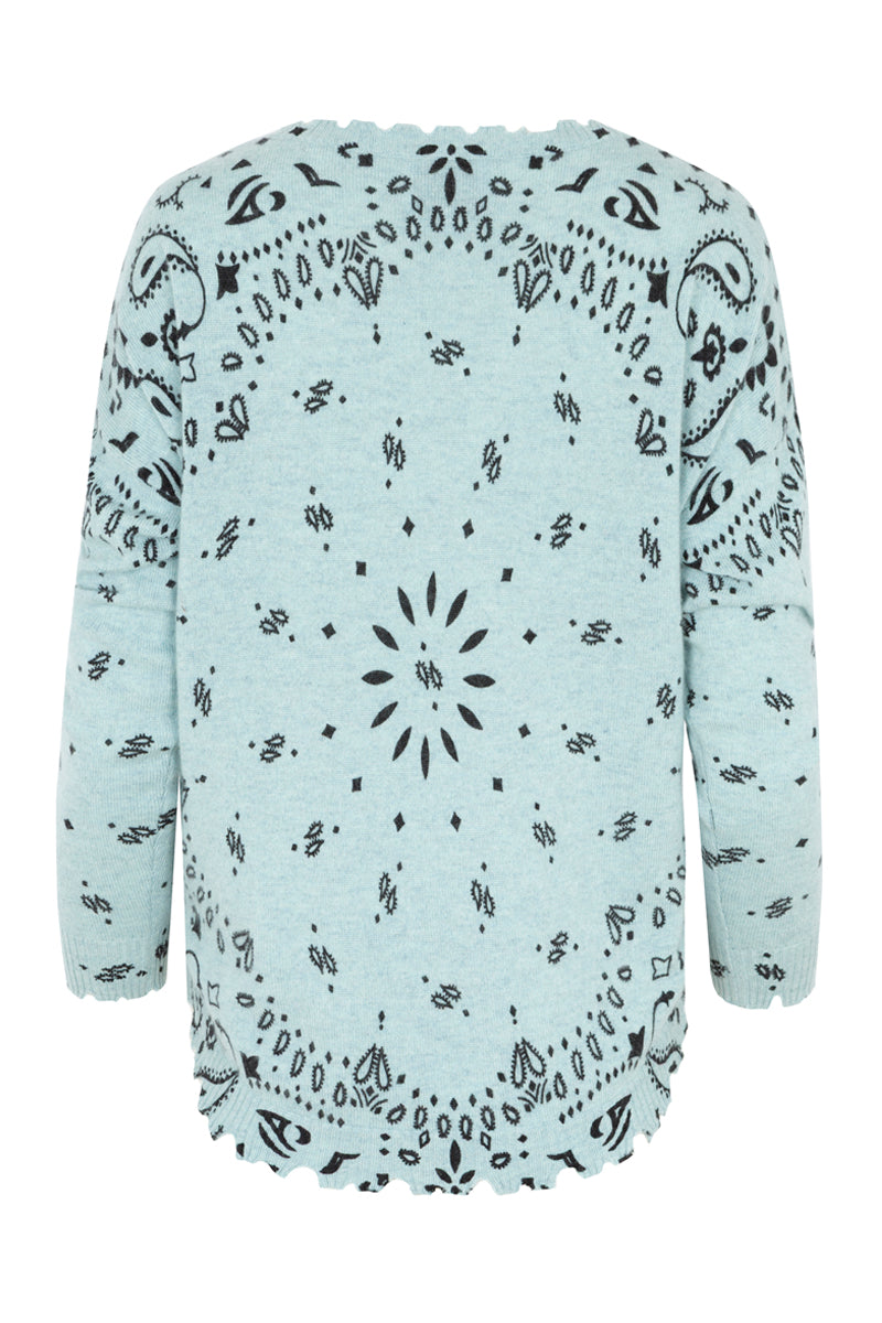 Jersey cuello caja, de la marca francesa Kujten. Bajo redondeado con acabado efecto desgastado. Color azul claro con estampado de bandana en negro. Composición: 100% Cachemere.