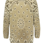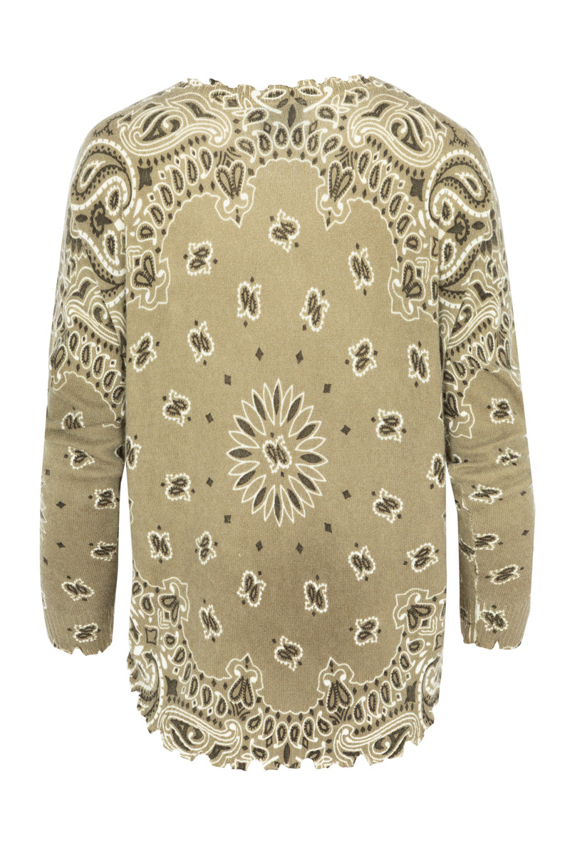 Jersey cuello caja, de la marca francesa Kujten. Bajo redondeado con acabado efecto desgastado. Color kaki con estampado de bandana en verde y negro. Composición: 100% cashmere.