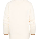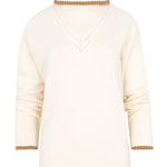 Jersey estilo oversize de la firma italiana Herno. Cuello vuelto en canalé asimétrico, manga larga y detalles calados formando un pico. Color crudo, con terminaciones en camel. Composición 100% lana. Hecho en Italia.