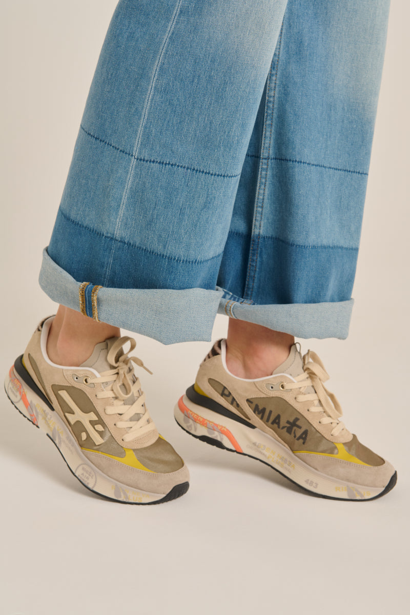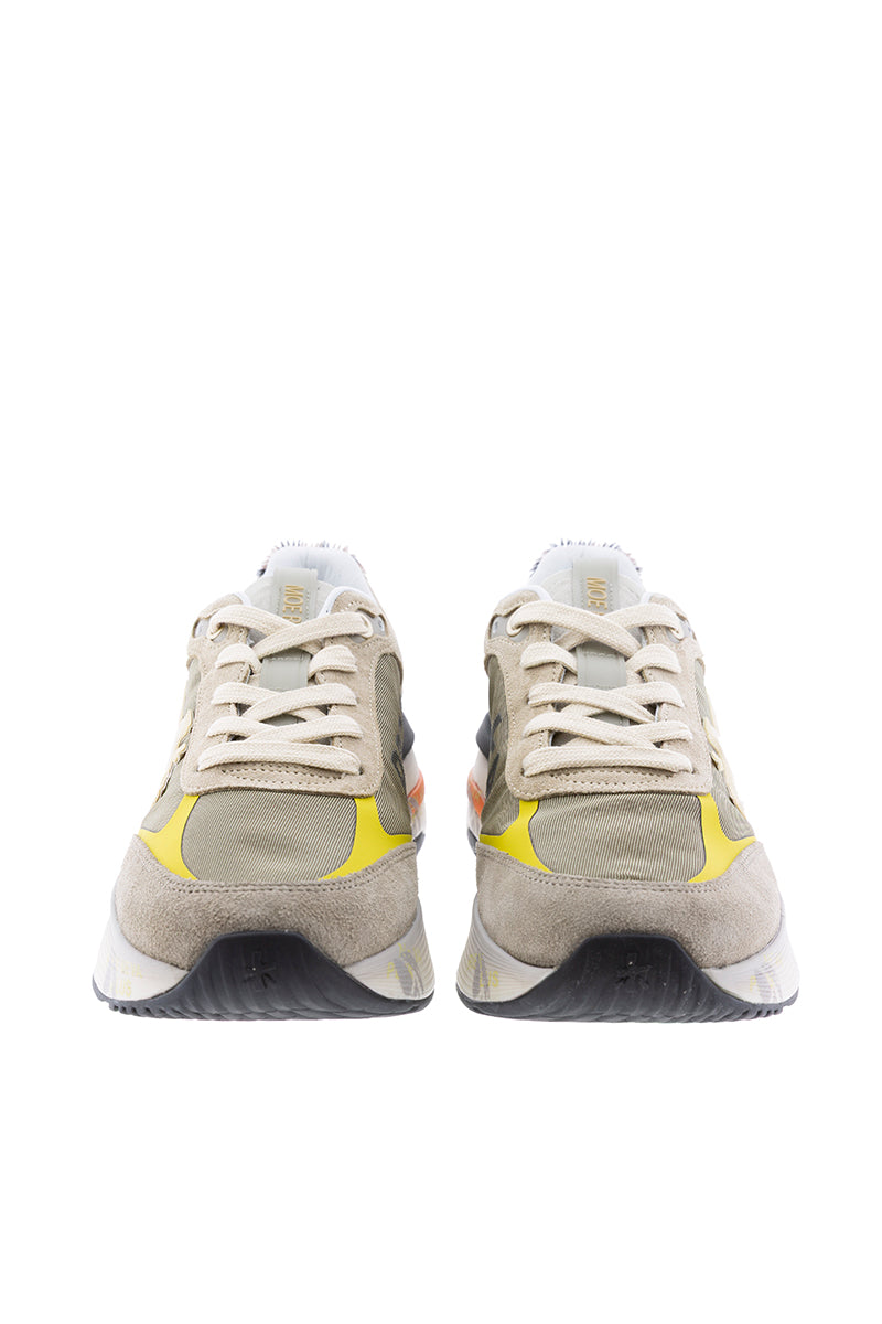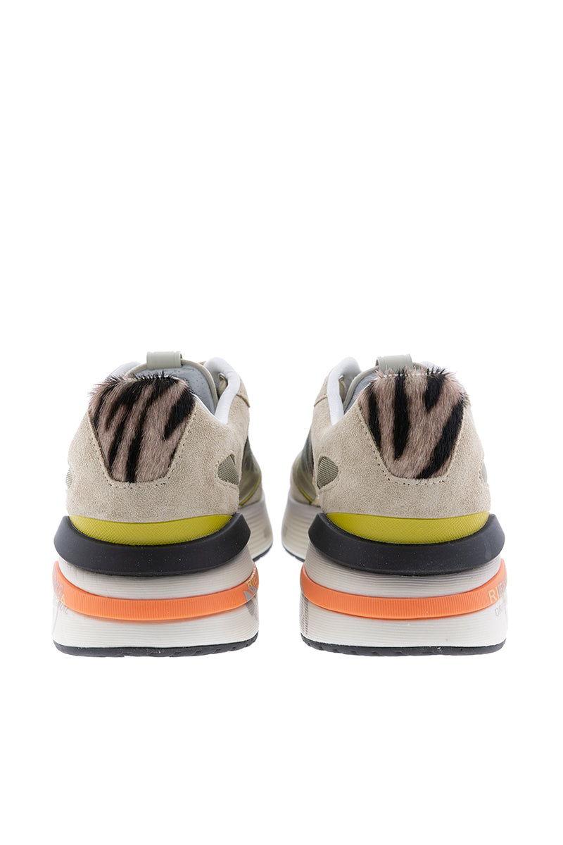 Zapatilla moerund, variante 7796. Tejido exterior en nylon topo, con puntera y parte trasera en ante al tono. Logo y detalle de talón en pelo animal print. Suela ancha, extra confort.