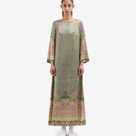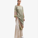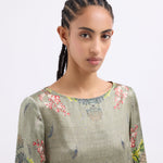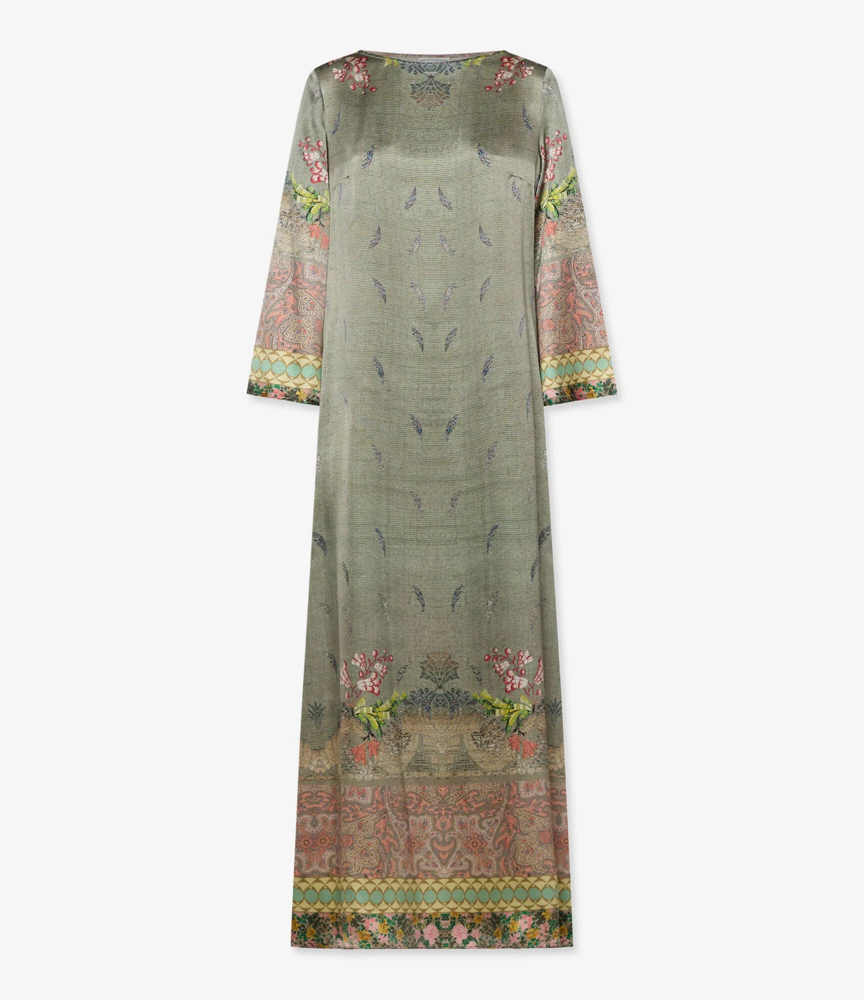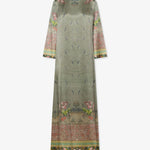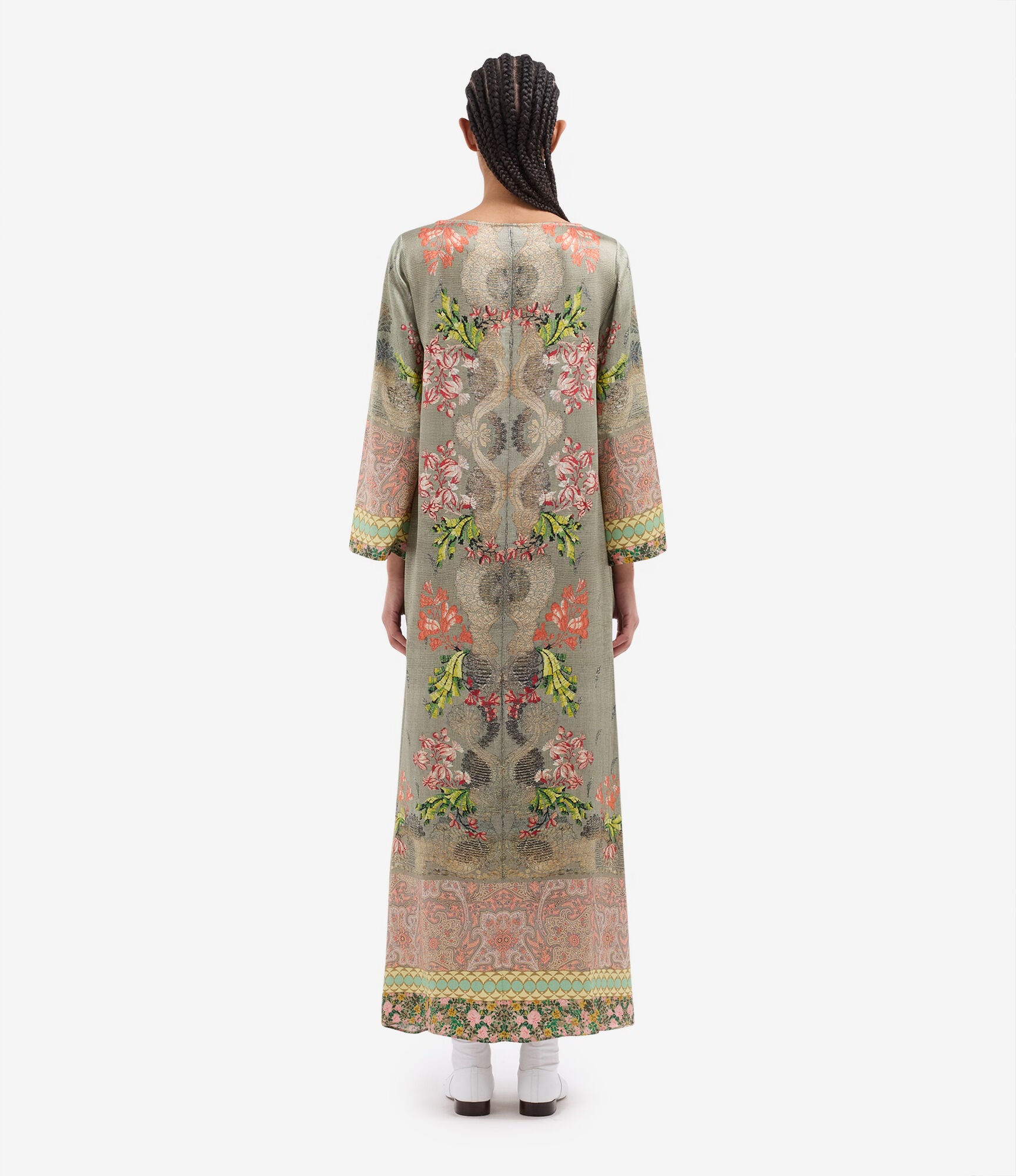 Vestido largo fluido con escote barco, manga 3/4 trompeta, bolsillos lateles y evasé. Color verde, combinación de estampados paisley, geométrico y liberty multicolor. Cenefa geométrica en tonos mostaza en los costados. Composición :100% Seda. Hecho en Italia. Tallaje italiano.