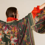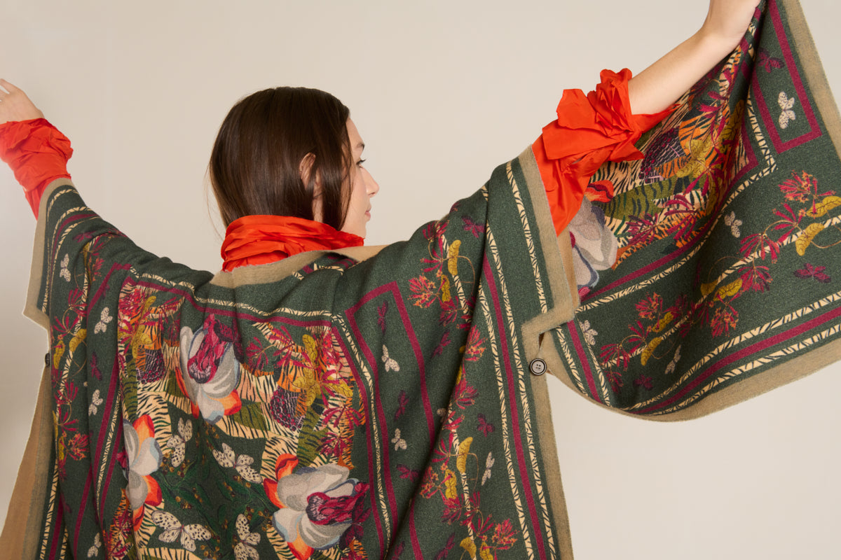 Poncho estampado reversible de la marca italiana Franco Ferrari en lana. Estampado floral sobre fondo verde loden y reverso en camel. Cierre con botón en el lateral. Composición: 100% Lana. Hecho en Italia. Talla única.