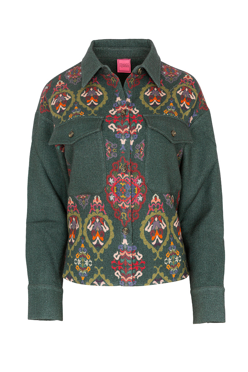 Sobrecamisa corta de lana con bolsillos delanteros, tapilla y cuello a contraste. Estampado ornamental barroco sobre fondo verde caza con patrones simétricos y detallados que