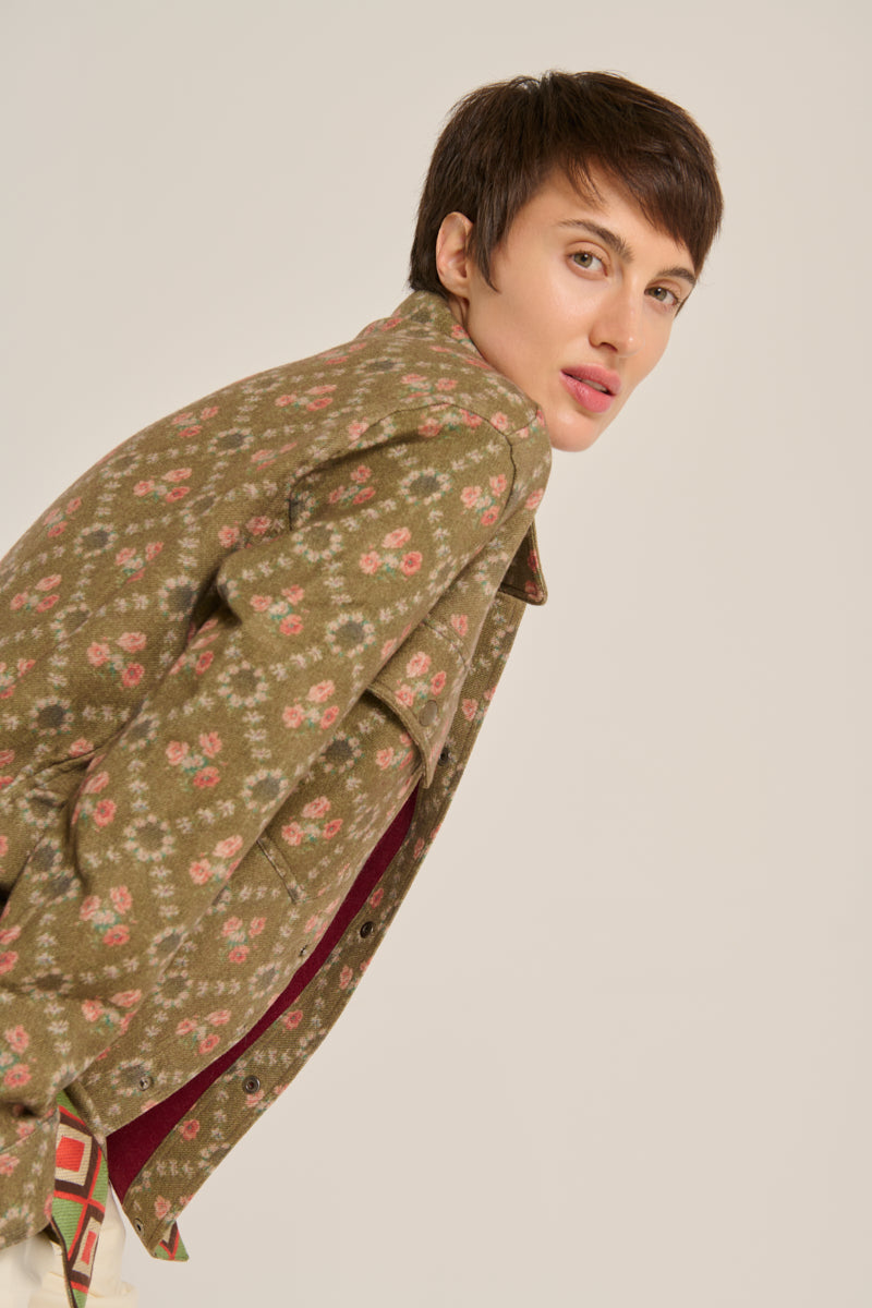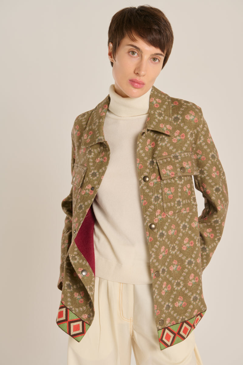 Chaqueta estructurada reversible, por un lado, flores liberty rosas sobre fondo verde, bolsillos de plastrón y cenefa de rombos en la parte inferior, por el otro, color total granate, exceptuando puños y solapas que mantienen el estampado floral. Composición: 100% lana. Hecho en Italia. Tallaje italiano.