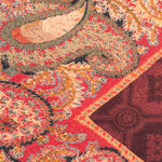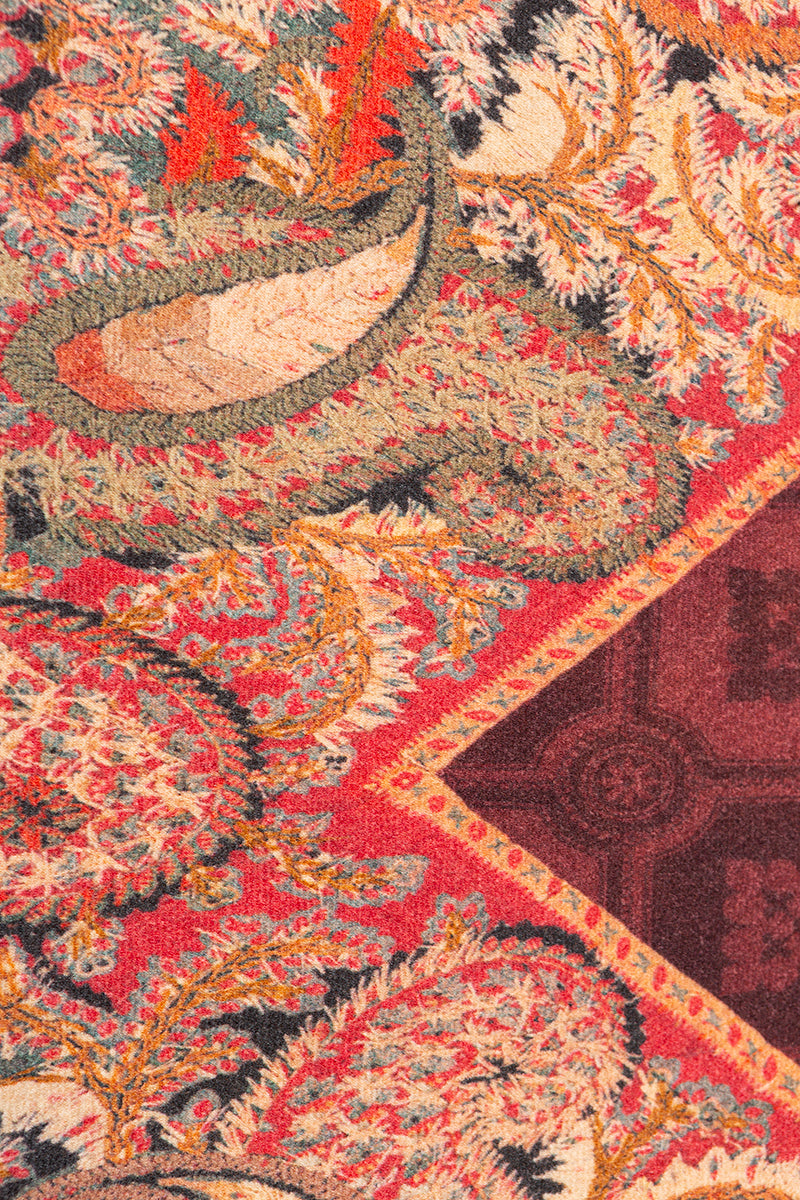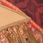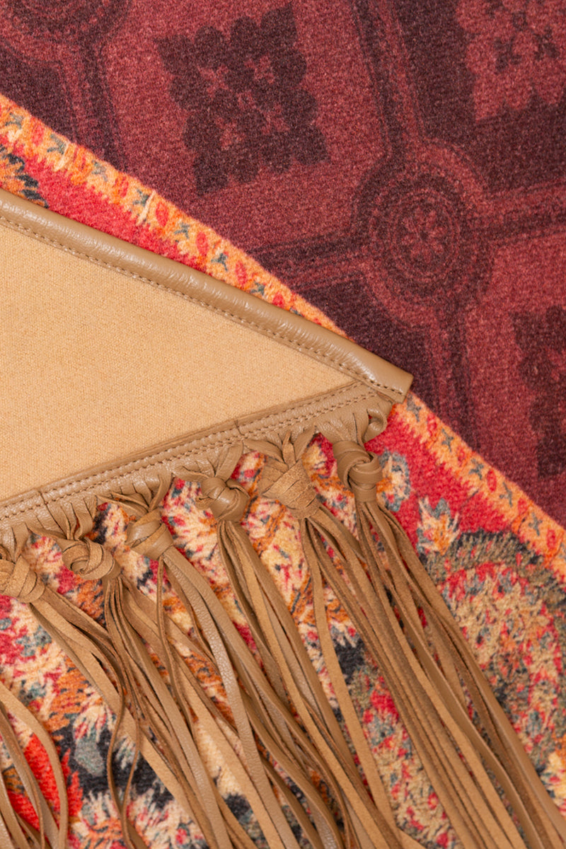 Pañuelo reversible en pico, tipo poncho , de lana ribeteado en cuero al tono y rematado con flecos también en cuero camel . Estampado de cashmere en tonos guinda, coral, burdeos por un lado y camel por el otro. Medidas : 135cm X135cm. Composición : 100% lana y 100% piel. Hecho en Italia . Talla única.
