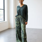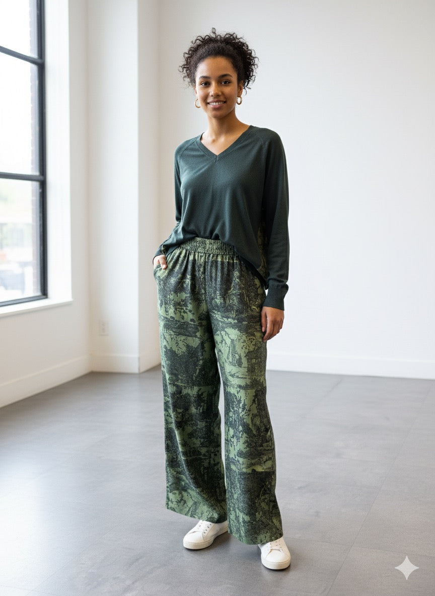 Pantalón ancho con cinturilla elástica, estampado toile de jouy en tono verde. Composición: 100% Seda, 100% Lana. Tallaje italiano. Hecho en Italia.