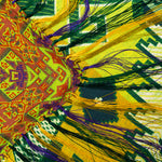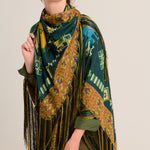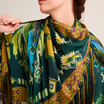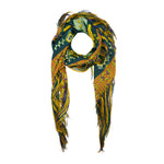 Pañuelo Pierre-Louis Mascia en seda natural 100%. Combinación de estampados étnicos en tonos verdes, pistacho, mostaza, amarillo y cenefa en pistacho,maquillaje,azul y naranja. Acabado fleco largo en seda en verde, morado y oro. Tamaño: 135 x 135 cm. Hecho en Italia.