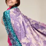 Pañuelo Pierre-Louis Mascia en seda natural. Estampado con motivos pastoriles, característico del toile de jouy, en violeta y piedra en el centro y cenefa con estampado floral en verde petróleo y piedra al rededor. Composición: 100% seda . Desflecado medio. Tamaño: 135 x 195 cm. Hecho en Italia.